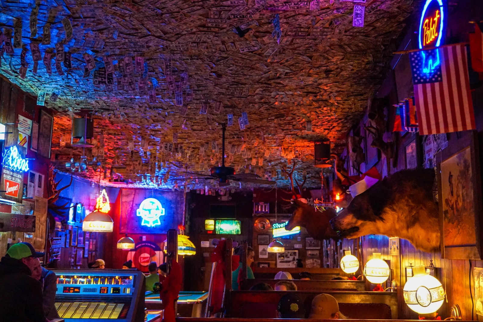 Saturday 7 pm: Snowbiking is a lot of work and it’s time to refuel. If taking public transit, kill time until the 9:45 pm ski bus, and enjoy dinner at Carlos and Harley’s in Eden. If you’re driving, make the ten mile drive around Pineview Reservoir to the town of Huntsville and the oldest bar in Utah, the Shooting Star Saloon. Order a Shooting Star Burger – two beef patties, grilled onions, cheese, and a knockwurst on a bun – and a pitcher of Heidi’s Special. Take a photo of Buck, the 298 pound taxidemied St. Bernard. But don’t stop moving, there’s one more physical activity on the books back in Ogden, where we learn how to throw axes at Social Axe Throwing.