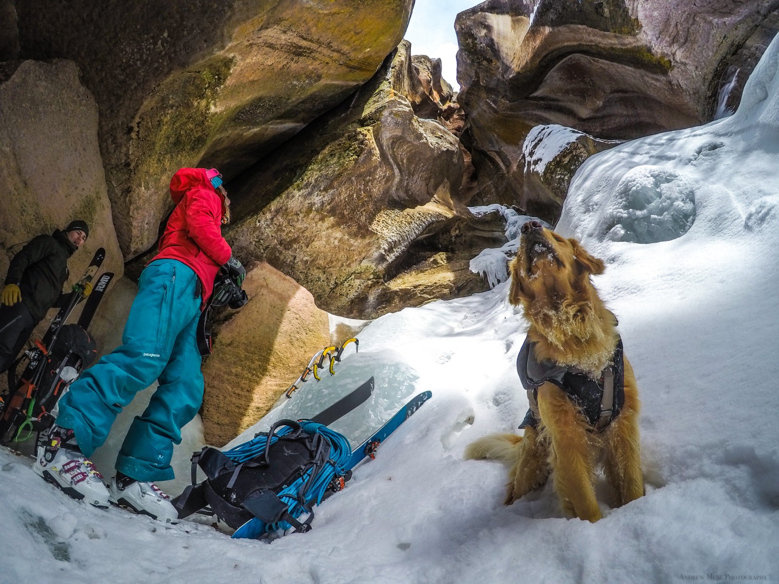 We drove from snowy Park City, Utah to the the the La Sal mountains which stand prominently behind the desert town of Moab. The La Sals are one of my favorite places on earth and it's easy to see why. Where else can you snowboard to the bottom of a sandstone slot canyons and ice climb back up through with you dog and best friends???