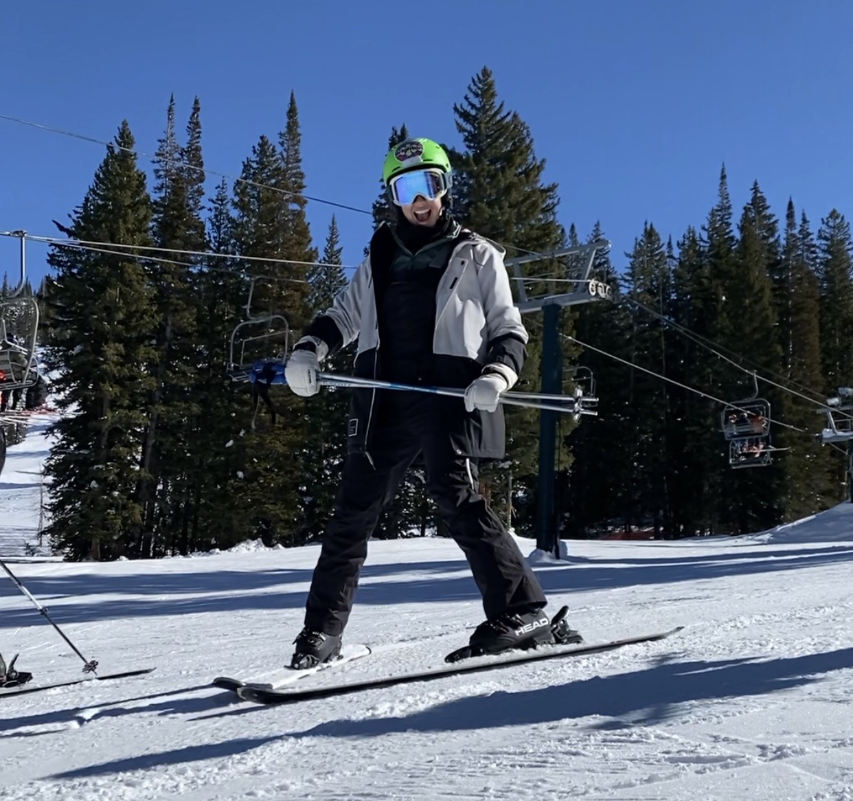 An hour into the mechanics and Erica gets on the chairlift. As I stand below and watch her pass above me, I can hear an excited cheer. Time for her first run! Looking confident and proud, I see Erica start to make some small turns and figure out not just how to control her speed but also her direction down the run.