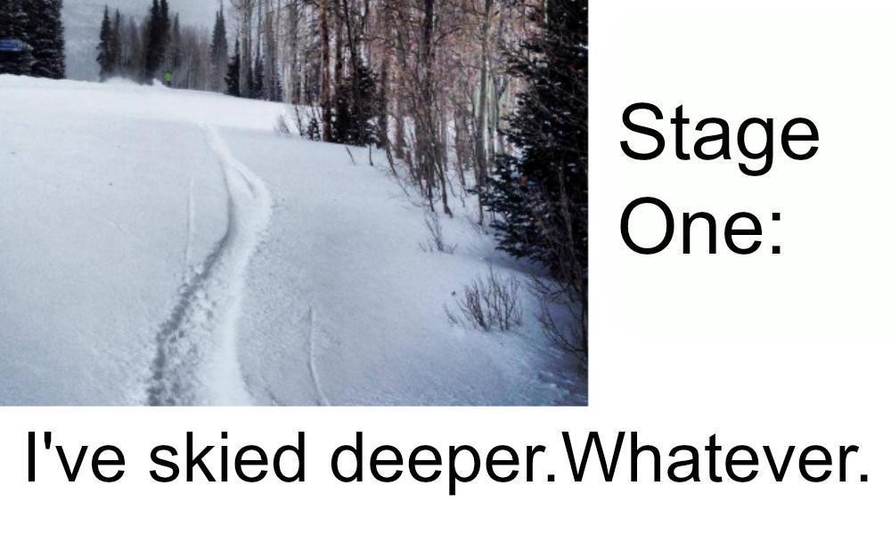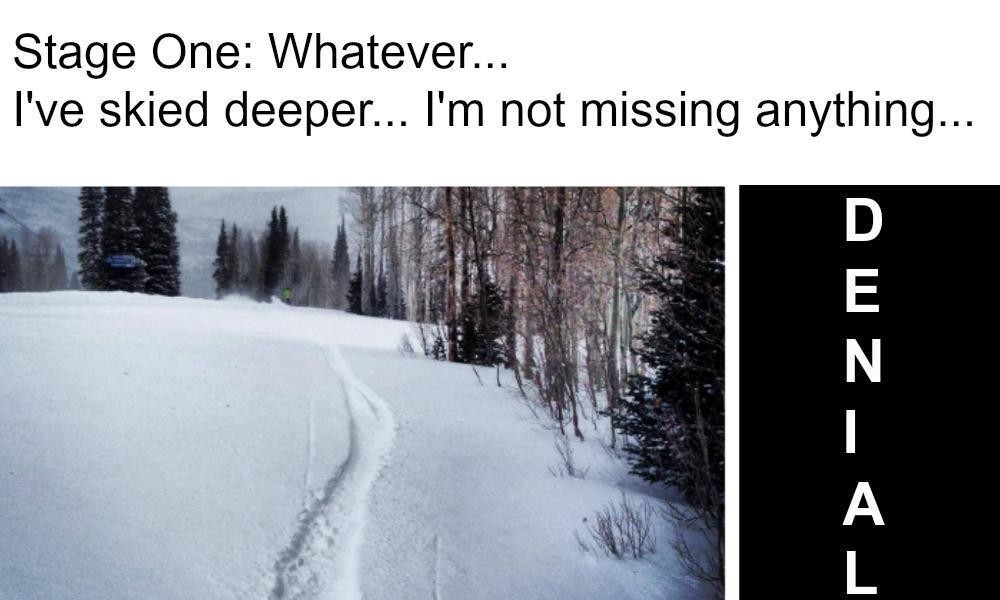 "Look at it. The snow isn't even that good." "I heard there was a wind hold" "I bet it was heavy snow anyway" Yes, at first, you are going to just not believe it's true. Your struggle was getting to the office, clearing off your car, and sitting in meetings while every device available was blowing up. But you know your friends. They're probably exaggerating. Your defense mechanism is to mistrust their excitement.