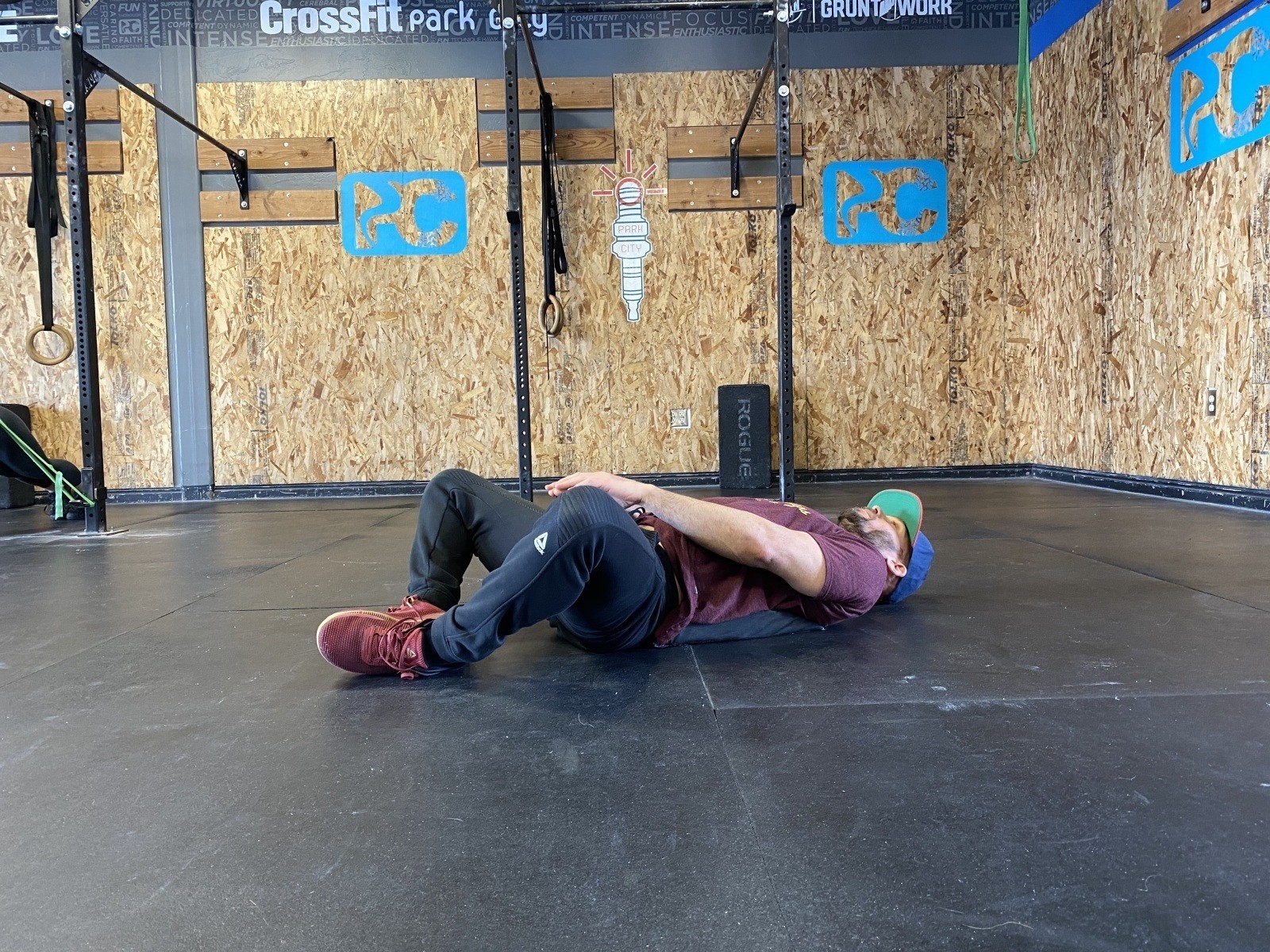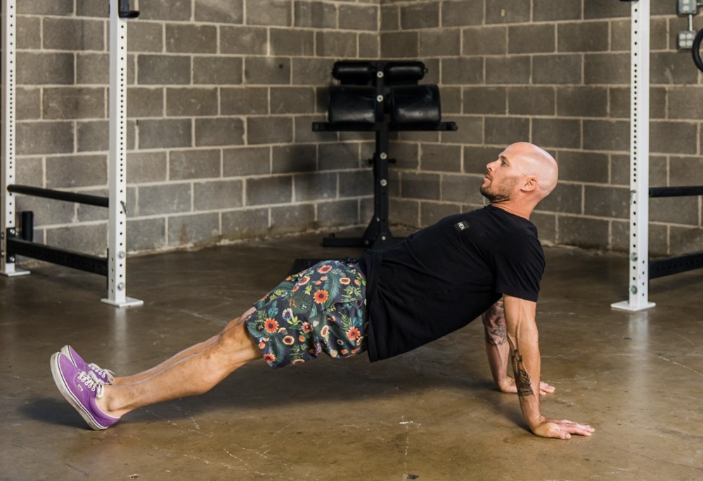 If this is easy try extending one leg, then the other. If you can still keep the hollow position with the small of your back on the ground try extending your arms overhead. If you’re a real pro and can still hold this position try rocking back and forth where your low back is still the only thing on the ground.
