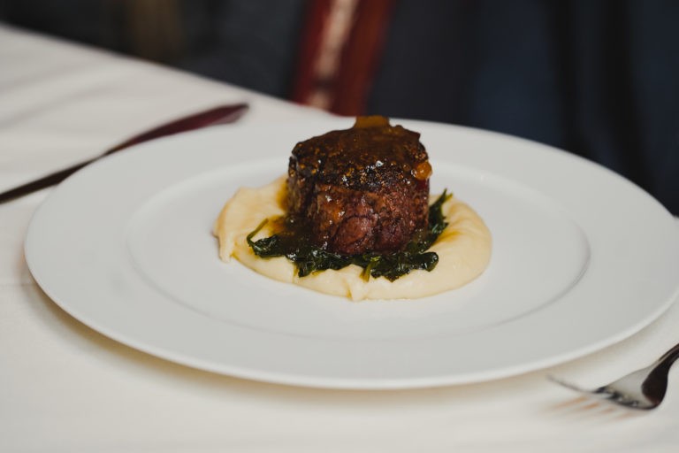 An iconic staple of the menu for more than 30 years, this entrée features a 7-ounce prime beef filet, locally sourced to honor Sundance's commitment to community collaboration. The steak is encrusted with a blend of pink, green, and black peppercorns, creating a symphony of aromas that signal the exquisite experience awaiting diners. It's complemented by a sweet mango chutney sauce, adding a delightful twist to the classic French bistro charm. The dish is elegantly presented with butter-wilted spinach and palm puree. Served at the Tree Room: Sundance’s first building (constructed around a living tree), built by Robert Redford himself in 1970.