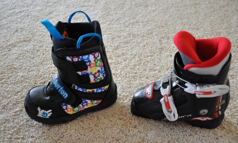 Snowboard boots...easy. Burton makes an awesome boot called the Grom. It is 2 sizes! Yep, way to get 2 years of wear out of a boot and save you some money. Refer to the photos, but on the bottom of the boot you'll see 2 sizes. You'll want to buy the smaller size. When they get bigger, you pull out the insole-refer to photo- and like magic, you have a larger size. Brennan is on year 2 of his boots! Also, I prefer the velcro to the ties when they are little. You can still get them tight enough without dealing with "tie my boots". I already deal with that enough with shoes! Snowboard boots are so comfy and soft you really don't need to pull out the insoles, you can just feel the back of their heel for fit.