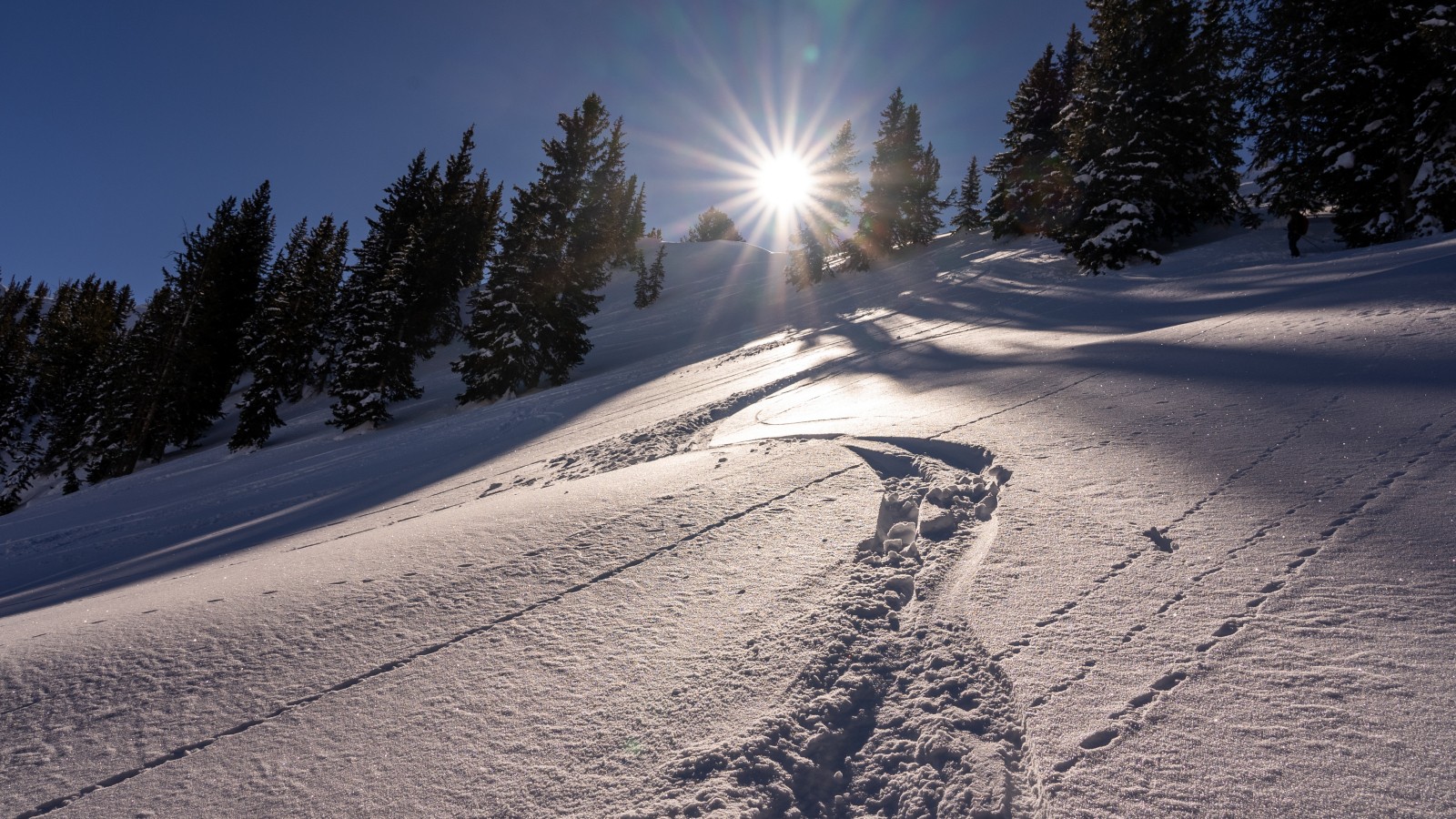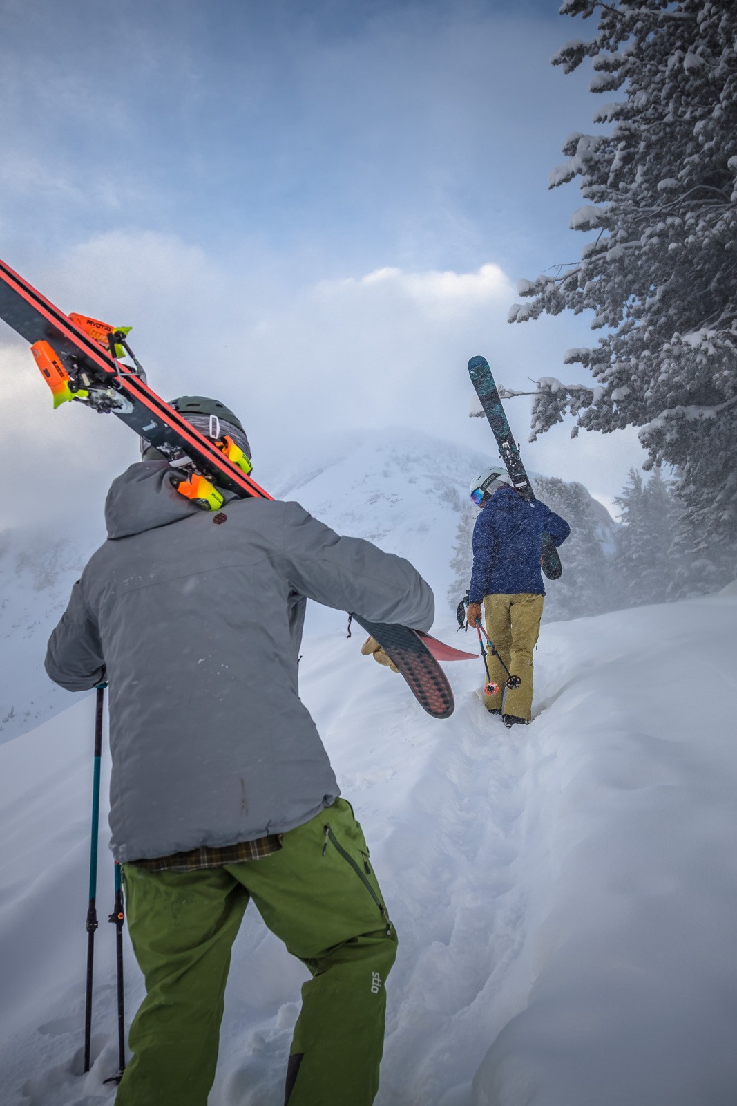The process of slugging through snow and breaking trails can be exhausting. Each step forward revealed exactly how much energy I was previously conserving. I finally reached the crest of the peak and looked down on an unreal canvas in front of me. Once I was strapped in, I looked back on the post holes I followed and left behind with gratitude and made turns that would live in my memory forever.