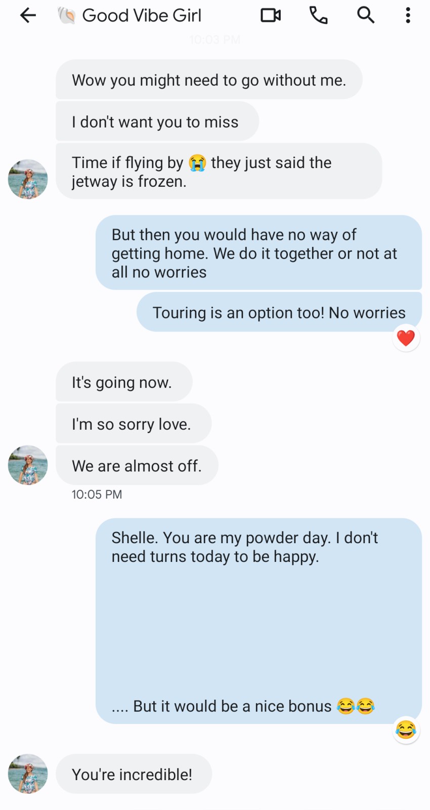 2:41 pm: Wow you might need to go without me. They just said the jetway is frozen.