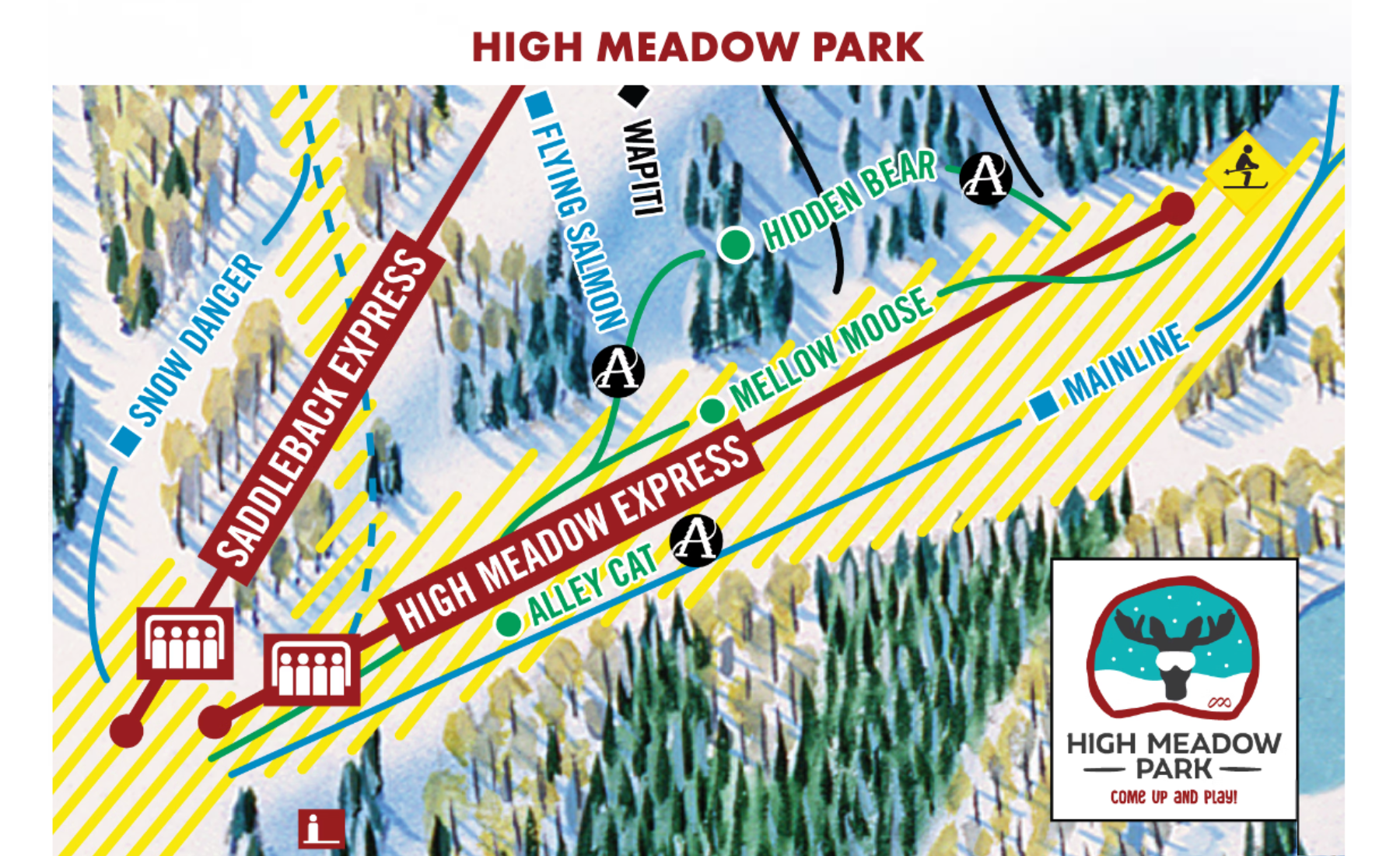 This side of the mountain offers the best and greatest amount of beginning and learner terrain. With the creation of High Meadow Park, learners are no longer restricted to the lower base elevation as it's located mid-mountain and accessed by gondola. This dedicated alpine learning zone features fun and gentle green runs with awesome views serviced by the speedy High Meadow Express chairlift.