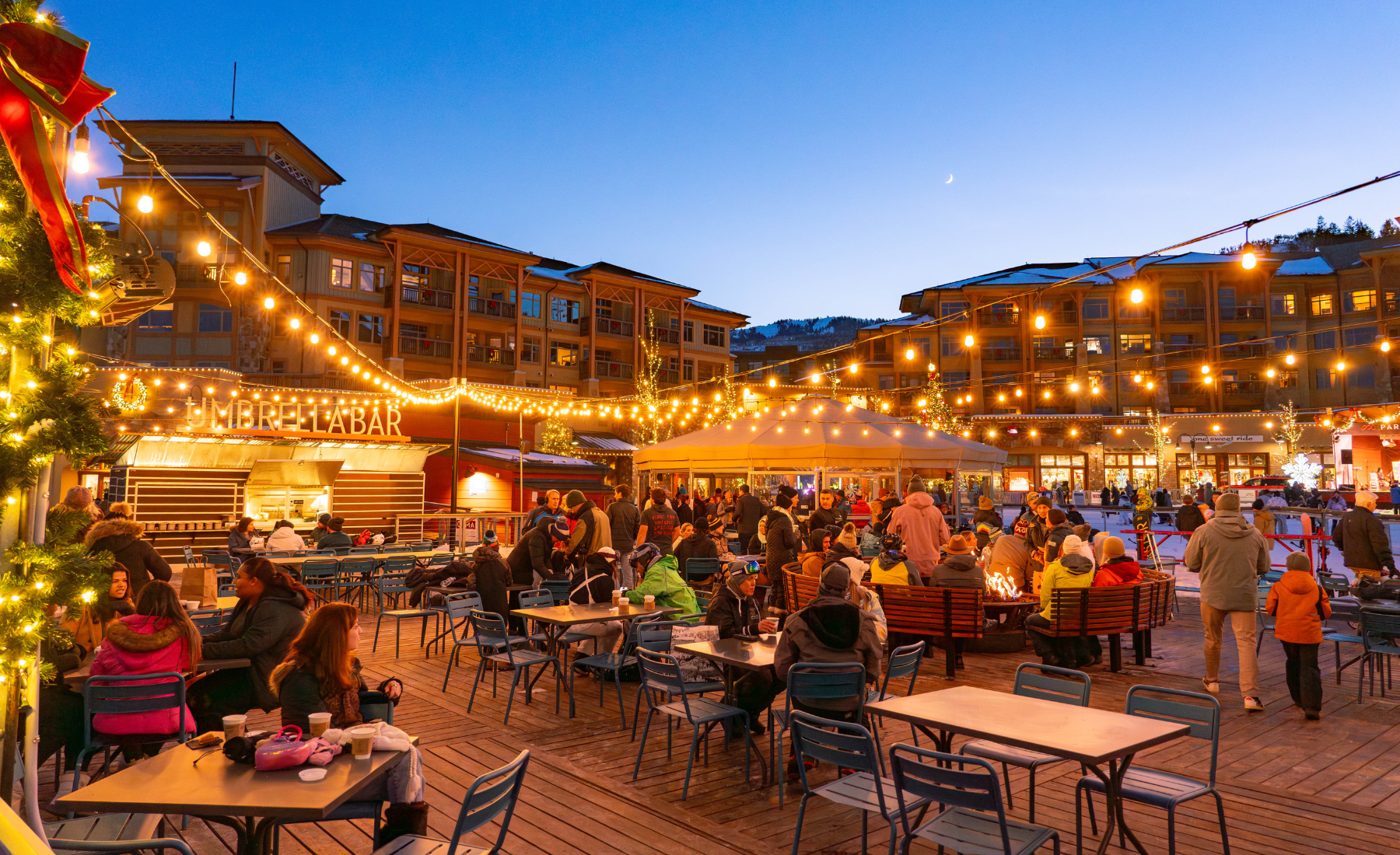 At the Canyons Village base area you'll find Red Tail Grill serving big mountain views and outdoor dining for lunch, dinner, and après. Hit the Umbrella Bar for its expansive patio, fire pits and lively aprés scene. More unmatched views can be savored at Lookout Cabin, reservations are recommended! Located at the mid-station of the Orange Bubble Express, Lookout Cabin serves Rocky Mountain cuisine complemented by a full-service bar.