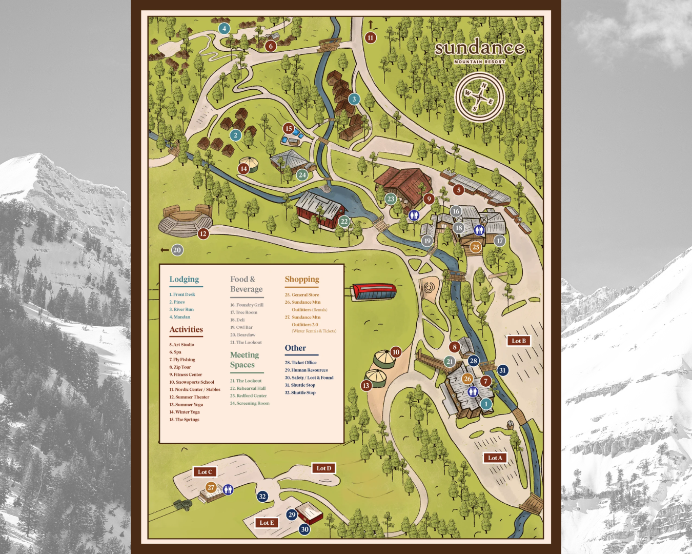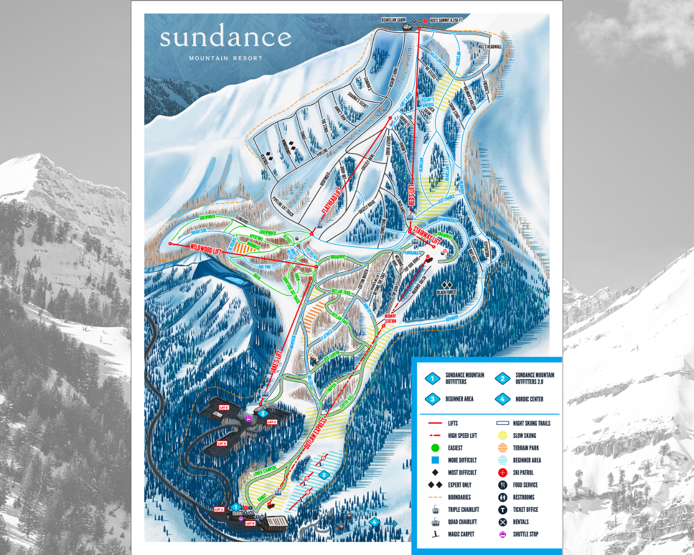 - The Creekside Building: Sundance Mountain Outfitters (demo, rental, and ski shop), day lockers, complimentary ski storage for lodge guests, Activity Desk and Administration