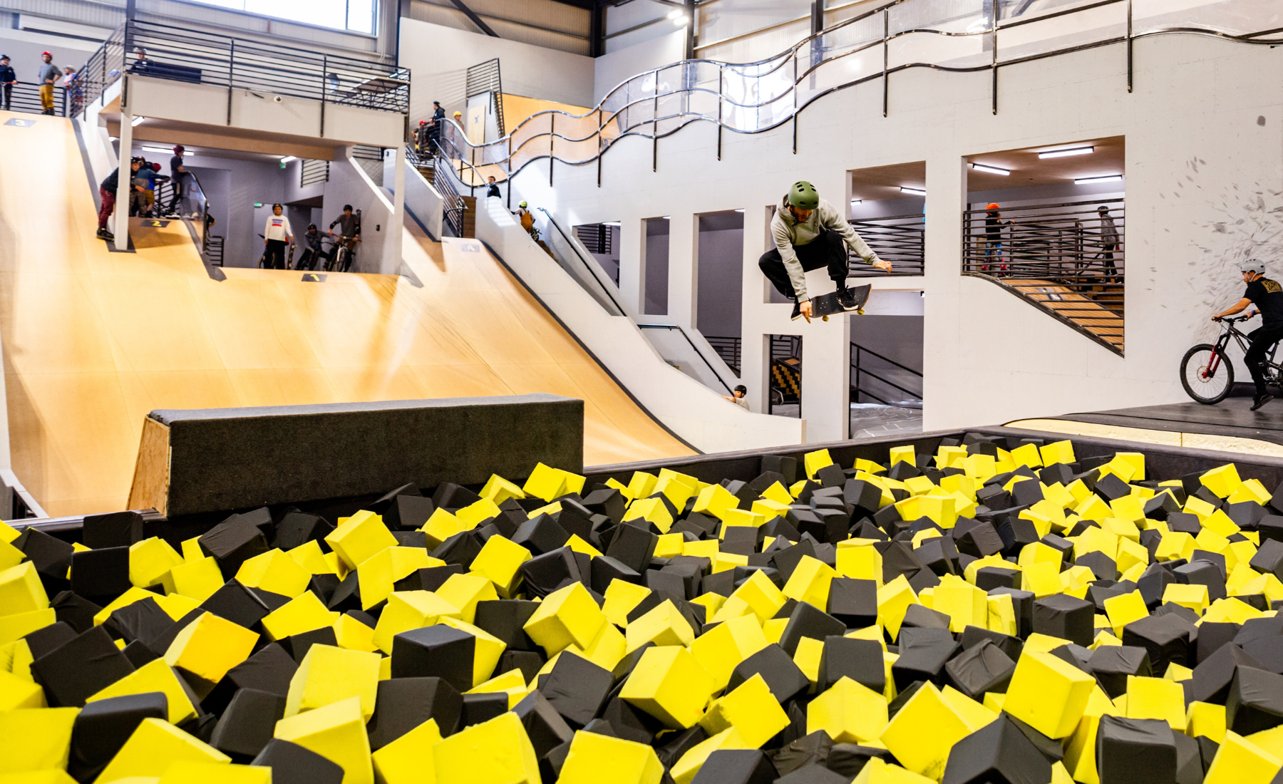 Action Sports Hub: 66,000-square-foot indoor facility with concrete park, bike pump track, mini ramps, parkour zone, spring floor, Olympic trampolines, foam pits, and digital media lab.