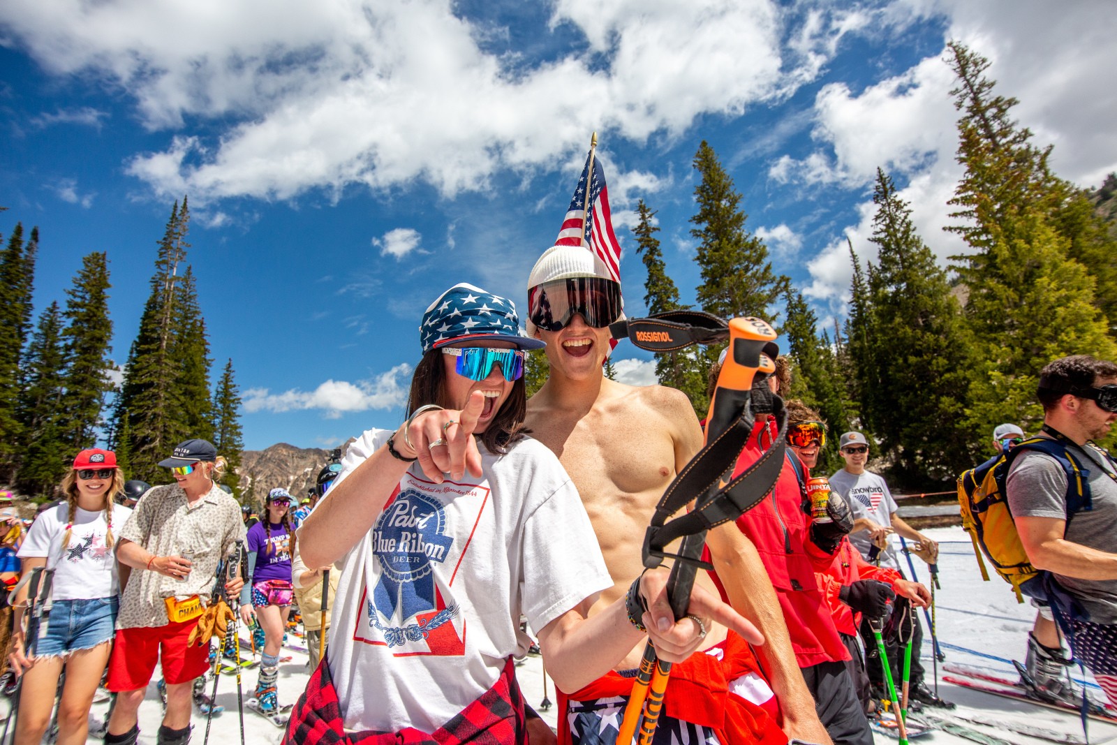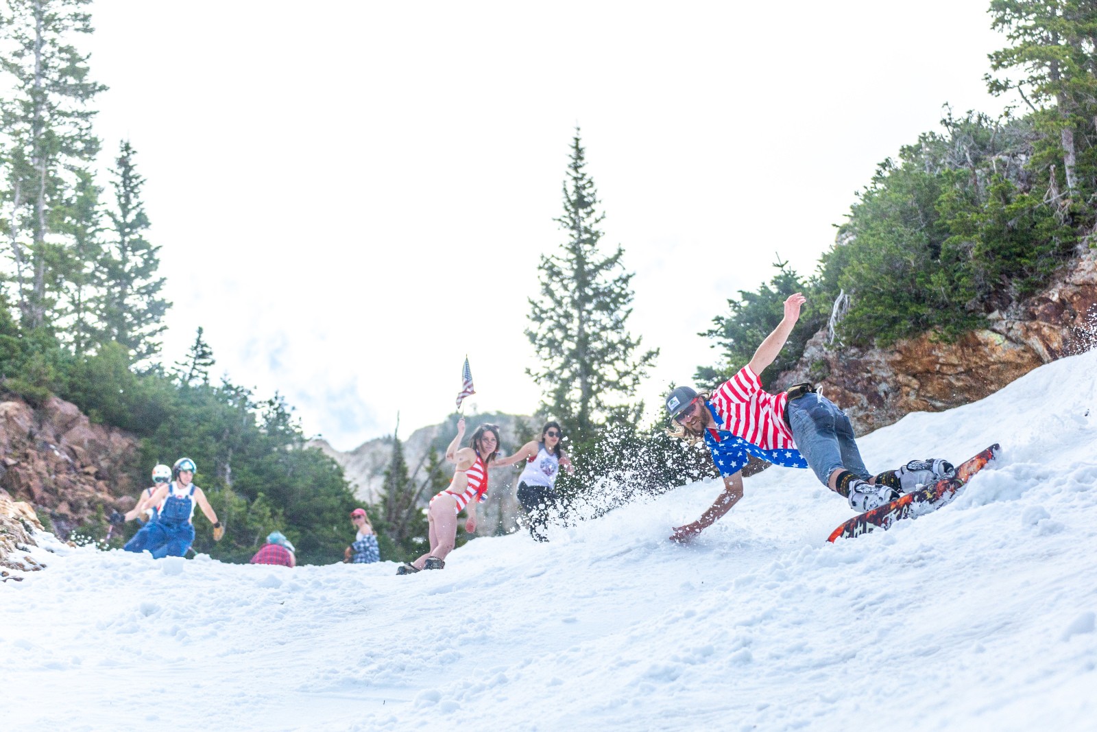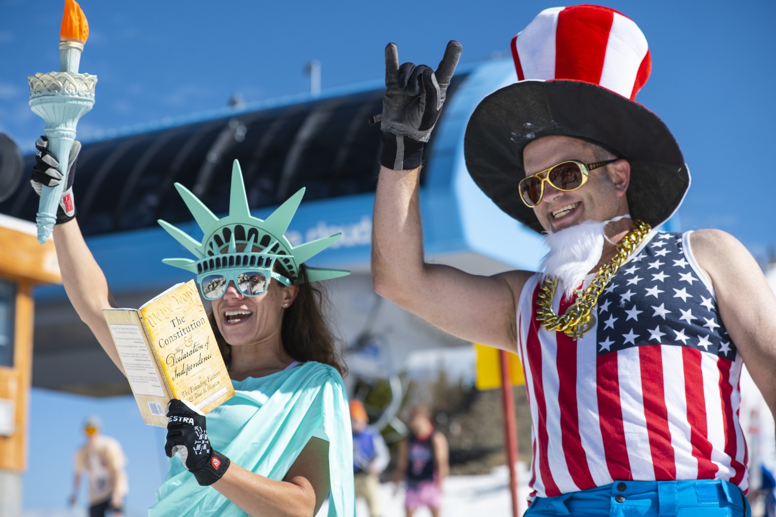 The tram line stretched to record lengths as celebrants draped with flags, costumes, and patriotic colors waited their turn to make their final turns in Little Cloud Bowl in July. Tram riders burst out into full-throated renditions of the Star-Spangled Banner. The American flag riotously fluttered atop both tram cars running full steam to transport the countless revelers up and down. The hoots and hollers of delight around Little Cloud could be heard from folks sporting bare skin, fanny packs, and flags. Nothing quite tops the sensation of celebrating freedom than a bit of skiing or snowboarding in July!