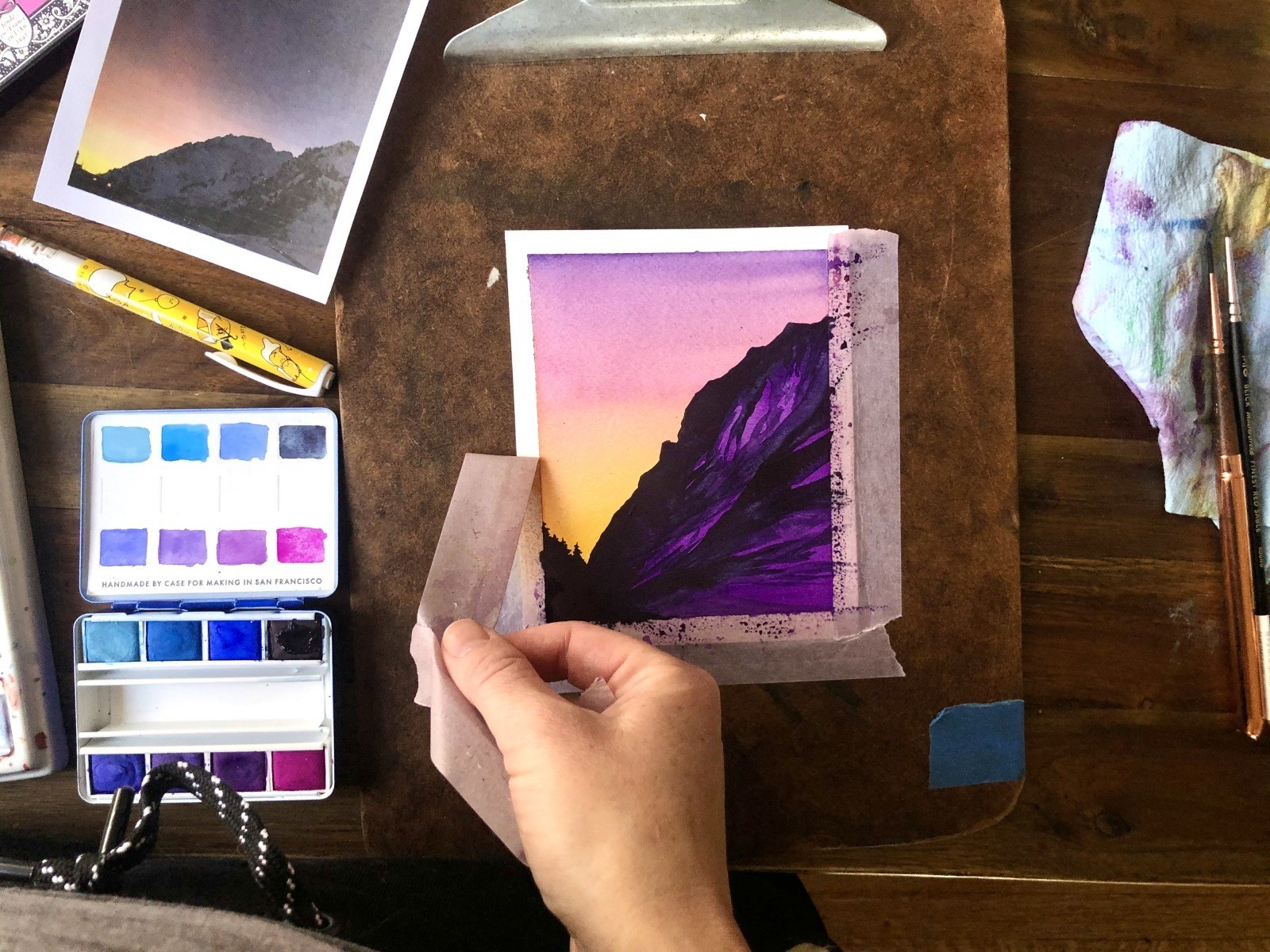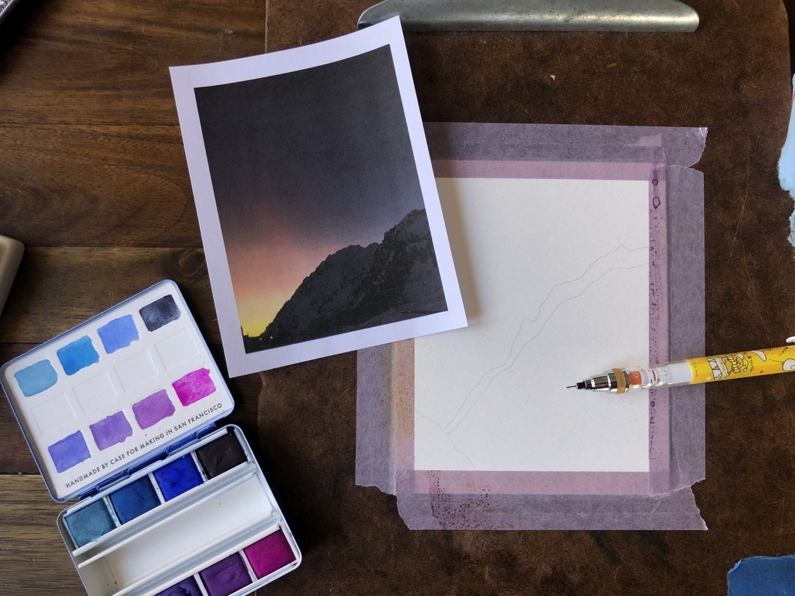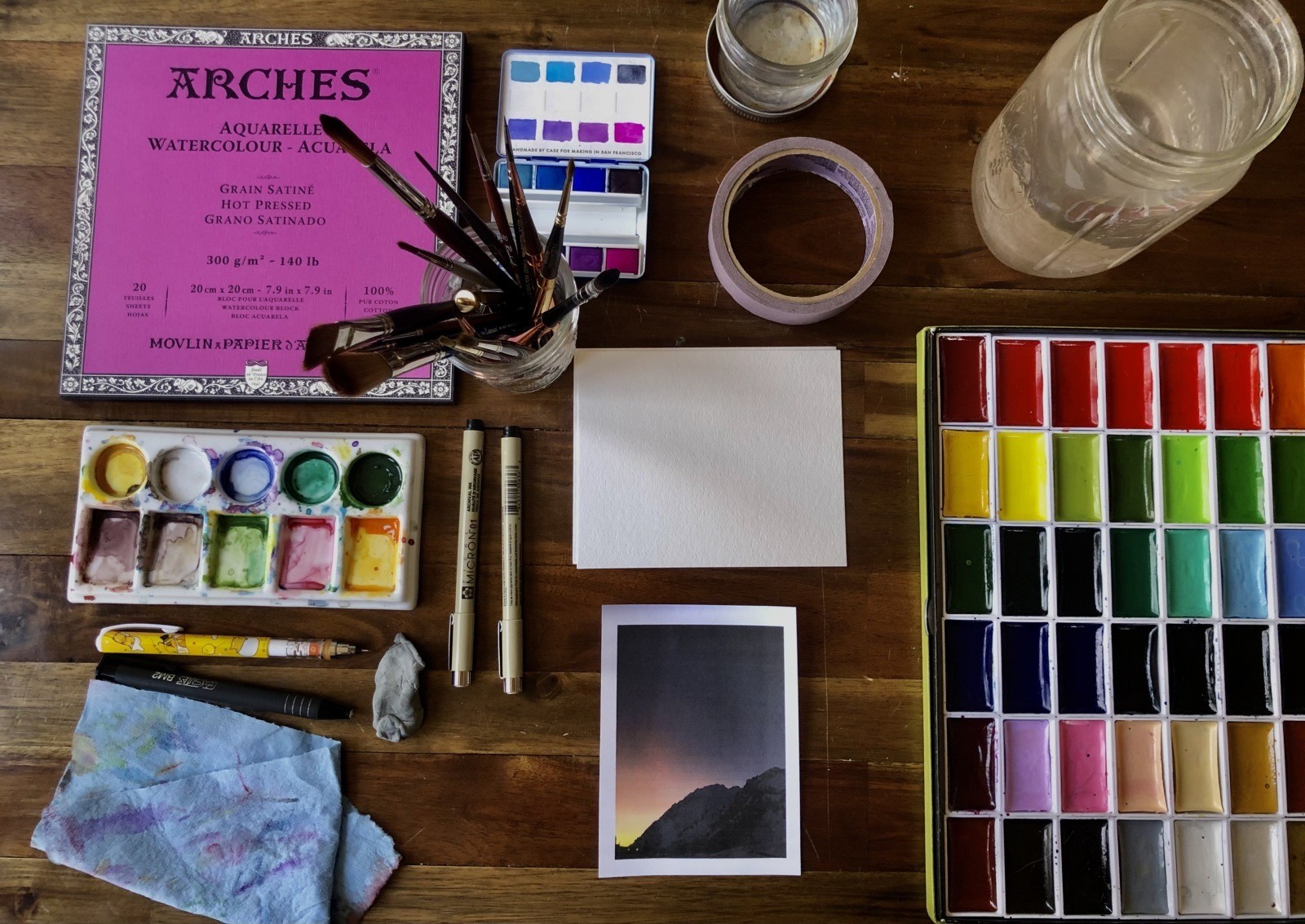 Before you can get started with your mountain watercolor, you'll need to gather a few crucial supplies. I've left a basic list below, but there is a far more comprehensive blog post on my website with recommendations about specific materials and the essentials a beginning watercolorist will want to have—click here.