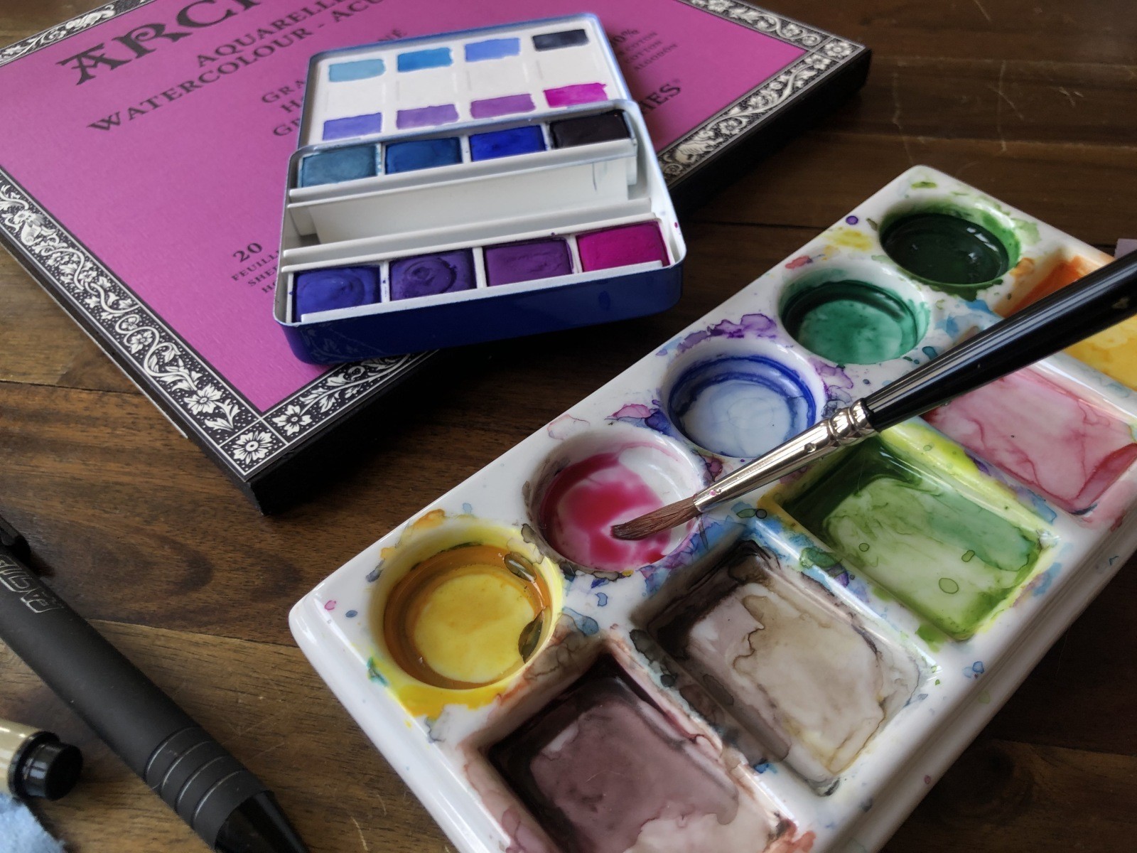 To begin our journey, we need to activate our watercolors. If you'd like to experiment with mixing, go ahead and select the colors you like and mix them together on a palette. For simplicity's sake, I'm using colors directly out of the watercolor pans and mixing the pigment on the paper using the wet-on-wet technique. (This means we'll first be wetting the paper with clean water and then adding water to our brushes to scoop up pigment and swipe it across the paper).