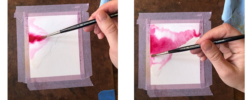Dip your brush in the clean water of jar 2 and pick up some pigment from your red or pink hues. Apply about three-quarters of the way up into your sky. You'll see the color rapidly bloom across the page—this is good! This is the 'flow' we're trying to encourage. Clean the brush in jar 1, then transfer your brush to jar 2 to pick up more liquid. Grab some orange pigment and streak it across the page below the pink/red. Remember to keep loose! Nothing on the paper is final until the paper is dry. Your one concern is to keep the purple and orange (complementary colors) apart. If they should mix a brownish color will be the result.