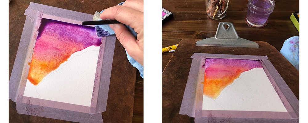 If you end up with puddles of water, gently tilt your clipboard so it accumulates in a corner, taking care to avoid mixing purple and orange. Once you've corralled your excess water, dab with an absorbent towel. Keep moving the pigment over the paper. It will continue to mix and mingle until it dries. You must work quickly during this phase. Don't overthink it and just GO WITH THE FLOW!