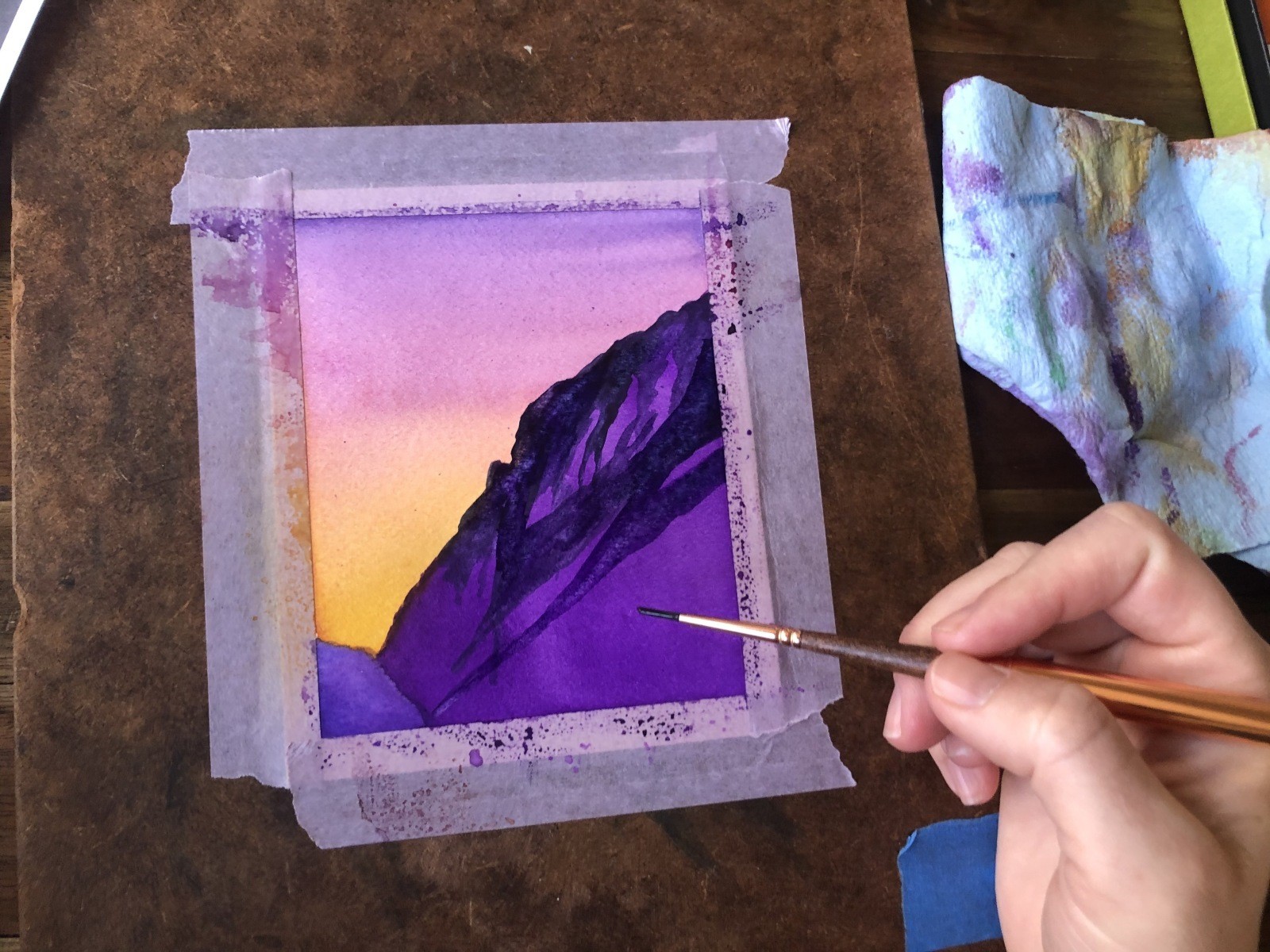 Once your mountain is dry or mostly dry, it's time to add some definition and shadows. Pick a darker pigment for this part. This is another time when it's best not to 'think' about what you're doing. You are a mountain person. You love mountains. You know what mountains should look like. Don't fret about accurately capturing every nuance of the geology, follow your intuition and simply add organic shapes. Think about ridge lines that trend downward in predictable ways.