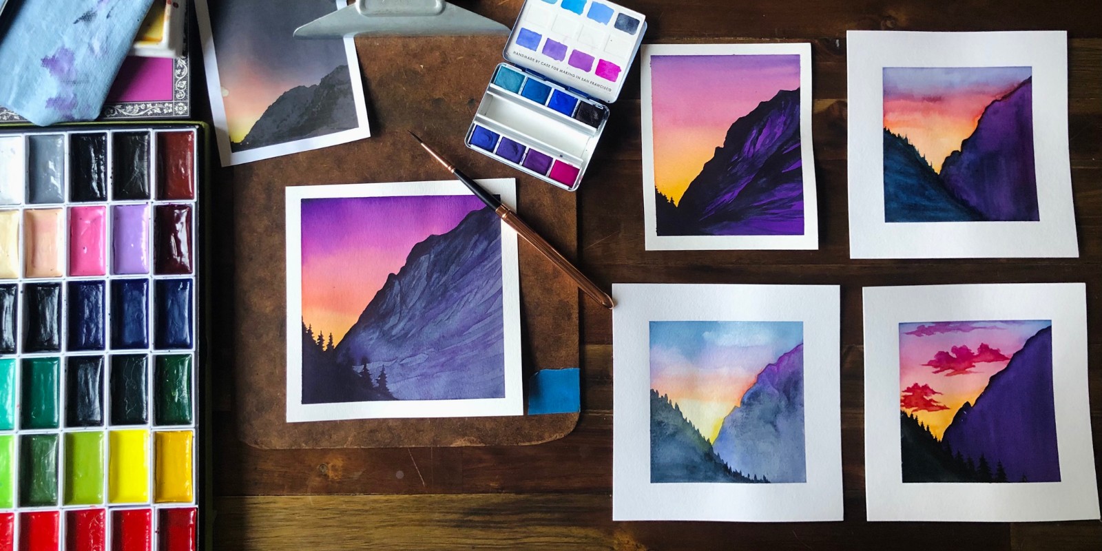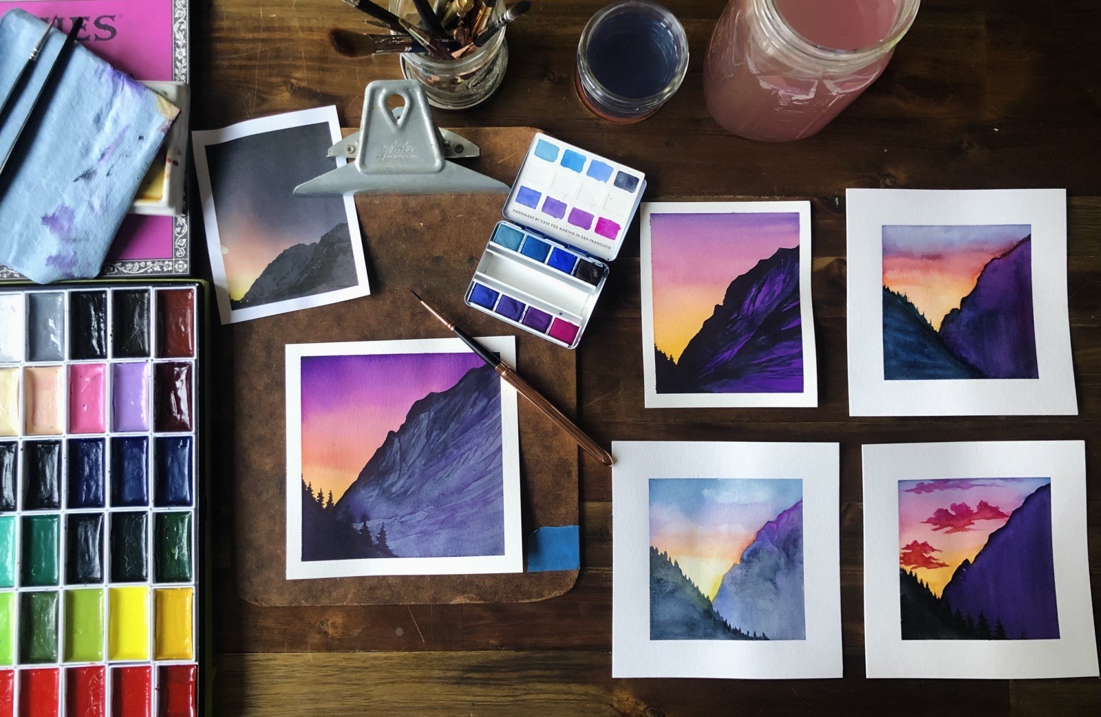 I work in the ski industry so with the sudden shuttering of resorts across the world, my job came to a screeching halt and I didn't have much work to do. I decided to try watercolor painting to ease the angst and found incredible satisfaction in learning this whimsical and wild hobby. This article will roll through some basics and provide a tutorial for painting a simple mountain sunset scene with watercolors using the wet-on-wet technique.