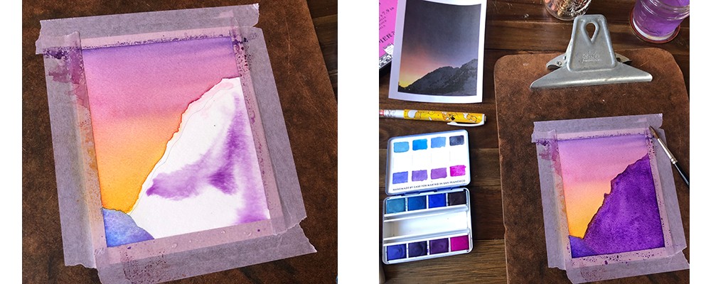 Pick a darker pigment for your mountain silhouette. I went with some deep blues and purples. Before beginning this second phase, be sure that your sunset sky is completely dry! Once you're certain, wet your paper again with jar 2 water like we did for the sunset, only wetting the area of the mountain. Add your chosen pigments, swirling and mixing them to add a bit of depth. You can be loose and quick with this step, it's just our base coat and we're going to add more layers. Once you have nice coverage, set aside to dry for another 10-15 minutes.