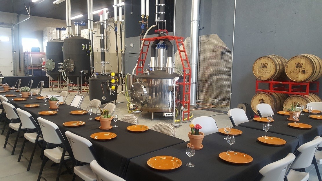 Just off the main junction, I found a new barn-style building where I was welcomed by a little gift shop and tasting room. Through large glass windows I could see enormous vats, pipes and barrels—where the spirit happens—and also some long dining tables decorated for a party; I happened to visit the same night that they were celebrating the year anniversary of when they broke ground.