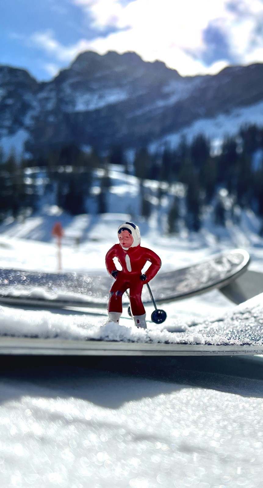 This would be Hooey’s universal rule of mobile phone ski photography. From shooting vintage toy skiers to groups of family members, turn the phone upside down. Don’t worry about cutting off the heads of your subjects. You’ll still capture their expressive faces, and you’ll get them (and the trees and mountain behind) from a more interesting and, often, more dramatic angle. Suppose you drop the inverted camera closer to the ground. In that case, the perspective will be even more dramatic, making the subject look like a looming yeti, which is terrific for photos of children (but not so good of their mothers).
