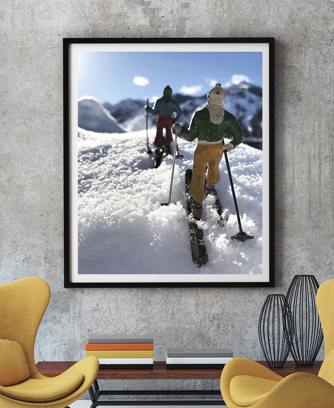 Hooey is on her way to her next shoot at…well, she doesn’t disclose where she is taking photographs that will eventually grace the walls of luxury homes and modest home offices. However, when she arrives, she’ll carefully remove each skier—sorry, there are no vintage snowboarders—and position them atop the snow to depict motion and emotion from these otherwise inanimate objects. They might be readying themselves on a cornice or making fresh tracks. As was the style in the mid-20th Century, their poles are tucked under their arms, their knees are almost touching but slightly bent. The scene resembles an oversized and overpriced poster found in a resale shop, but as Hooey moves her lens closer and closer still, these three-dimensional skiers become animated like the Rankin/Bass television characters Gen Xers and Boomers grew up with.