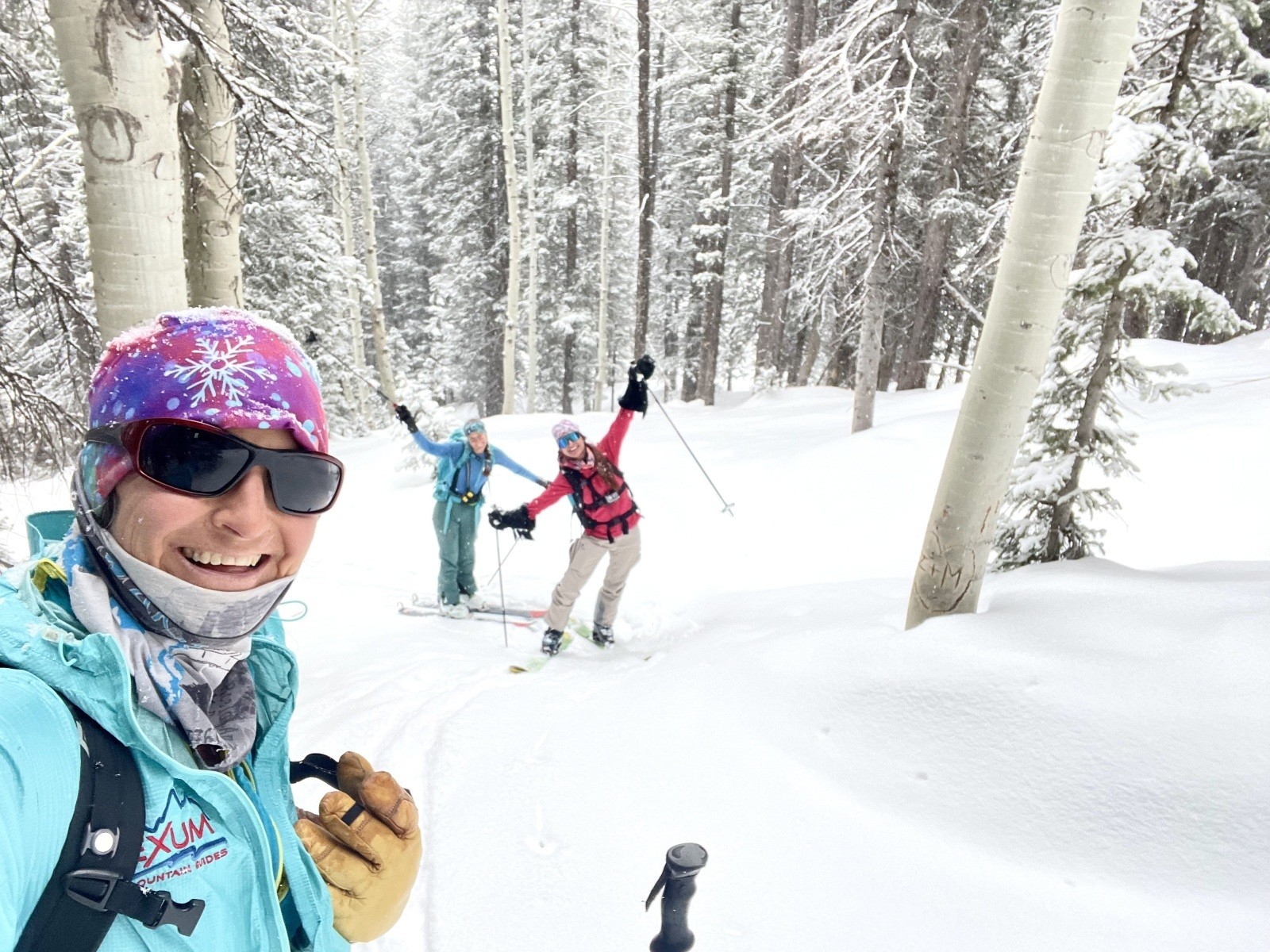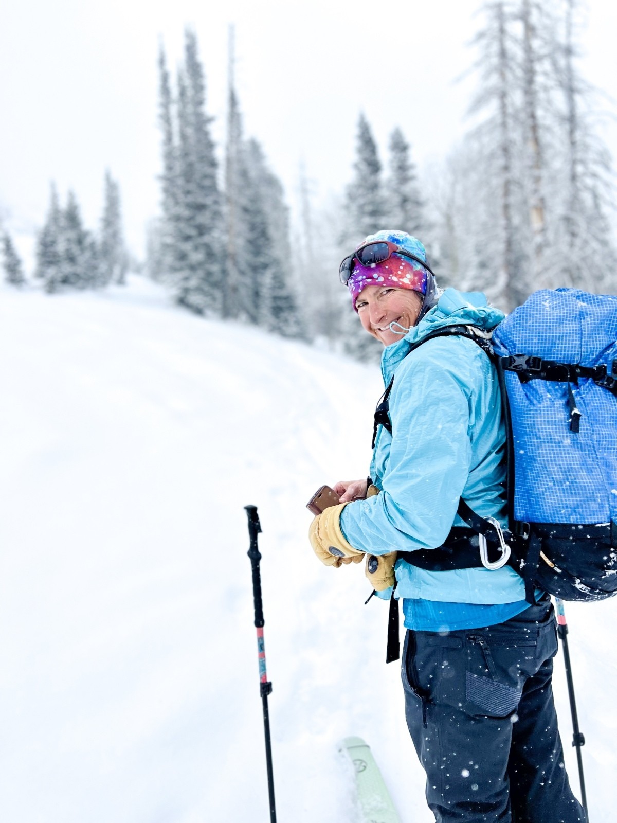 If this all seems confusing, it is…at first. My biggest challenge with my first backcountry tour was, in fact, the gear. It was high-quality equipment, but I did not anticipate the stress of trying to adjust boots from walk to ski mode, stripping off the skins, grabbing additional layers from my backpack and eating a snack on a frigid summit after a 2+-hour climb. My UMA guide, Winslow Passey, sipped her hot soup (which smelled amazing, and I will absolutely remember to pack that next time) and patiently walked me through and double-checked my buckles, bindings and zippers.