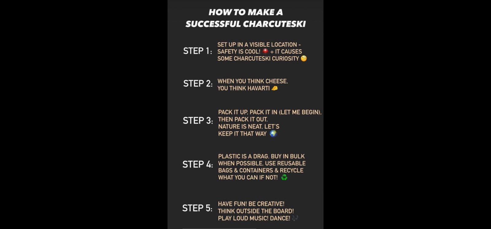 @charcuteski had 100 followers in 24 hours, 1,000 in a week, and like the virus that lurked in the shadows beyond the trees, the account grew exponentially and spread globally, reposting mountain meals tagged from almost every continent. As of January 2024, @charcuteski amassed over 20k followers and nearly 200 posts. Charcuteski.com provides tips and tricks, services (for Salt Lake and Park City resorts), and, of course, swag. It’s been featured by various publications, primarily described as a creative way to avoid pricier resort meals.