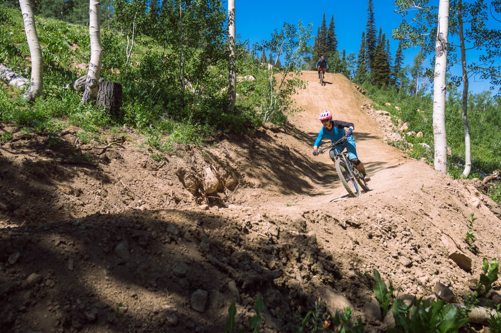 Before heading out, the first thing to know is that a ‘green’ mountain bike trail is considered ‘beginner’ but, like most lift-served resorts, presumes some mountain biking experience. If you’re new to mountain biking or the area, get a feel for the terrain on any one of Dirt Mountain’s adjacent cross-country, singletrack trails. They’re free, open daily and some of the best in the Wasatch Range. Brim Trail, a six-mile green loop near Hidden Lake Lodge, is a family favorite with panoramic views and carpets of wildflowers, particularly in early July. The Paper Airplane trail is a blue singletrack with some rocks and exposed sections leading to a big roll on the eponymous and enormous metal sculpture. Utah trails, even at resorts, are not theme parks. Don’t underestimate the risks or overestimate your abilities. As Susi Muecke, a Park City mountain bike instructor, cautioned during our preview, “Be true to yourself…ride within your ability.” You’ll have plenty of fun, and photos, on any Dirt Mountain trail.