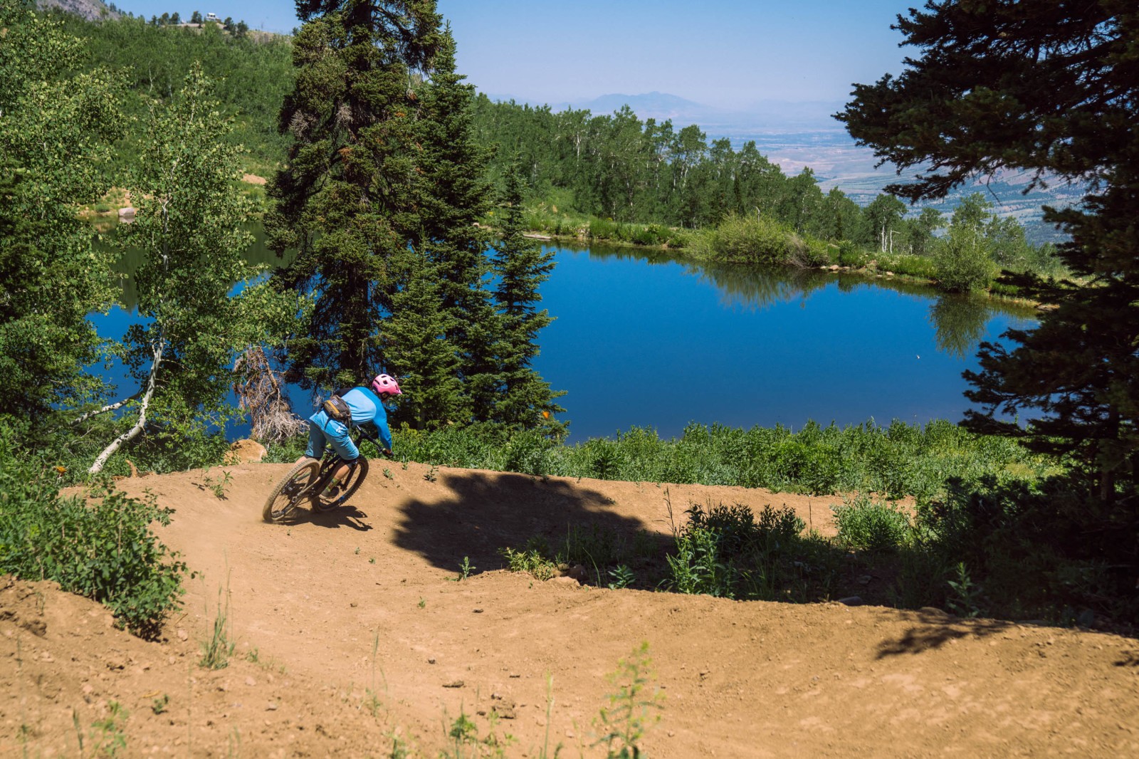 Over the same vertical drop, Big Ern is shorter in distance than Falkor and much straighter but, because of the undulating terrain, does not feel steeper. Thus, you can take your fingers off the brakes and fly! Over the din of my ticking spoke hub, my hoots, hollers, laughs and “OMGs!” could be heard by everyone as they echoed down the mountain. Between each copse of aspens and pines, Big Ern is punctuated with ‘tabletops,’ flat or stepped-up mounds, that grow increasingly taller and wider as you move down the mountain. Despite my initial concerns (when I could no longer see above or beyond them), these true-blue trail park features are designed to be “rolled over” or, for the more experienced, jumped. The terrain continues to meander down the center of this Intermountain canyon for more than a mile before reaching Hidden Lake, an alpine tarn that is only visible during these summer months. (Yes, ski friends, that’s where the name comes from.)
