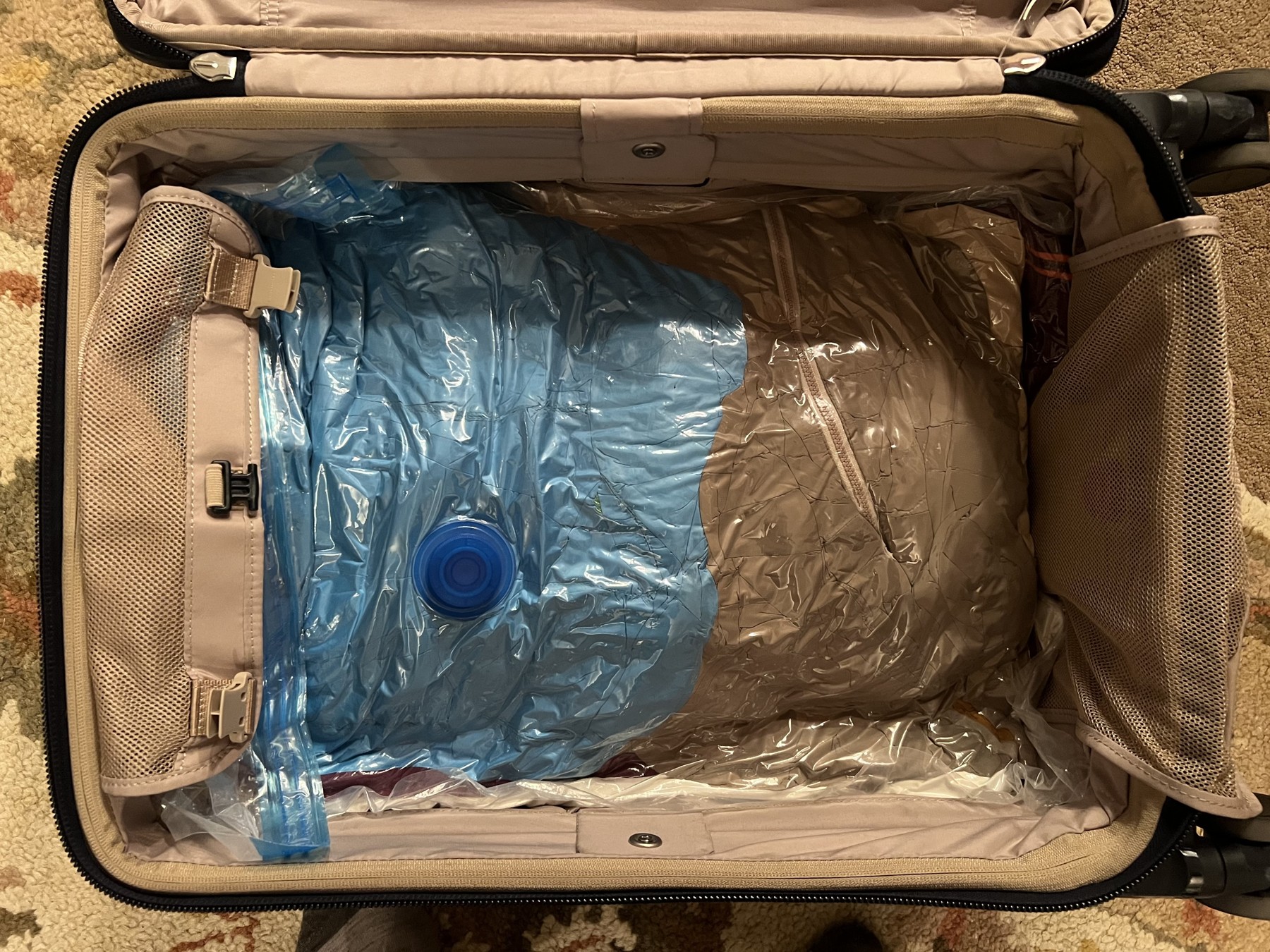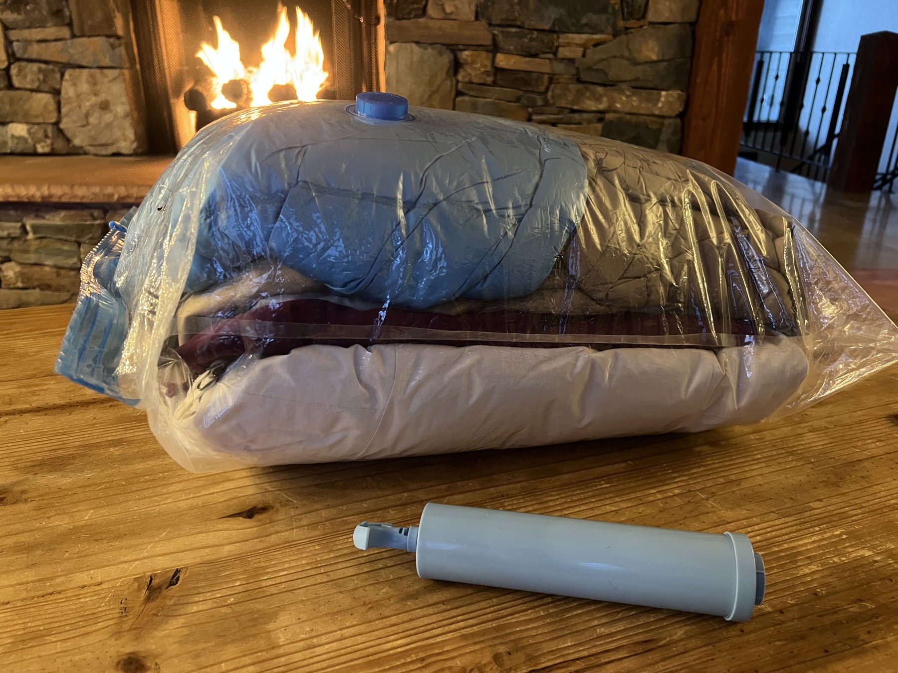 For skiers, “vacuum” compression bags are even better. They both resemble resealable food storage bags (the ones that sound like ‘flip-flop’ or TikTok) and are affordable and widely available at most hardware and grocery stores and online. Fold your clothes, place them into the bags, and seal them shut. You then remove the air compressing the clothes by approximately ⅓ to ½ the size. Depending on the bag, this is done by manually “squeezing” or pumping (with a hand or small electric pump that typically comes with the bags) out the air. Then, flip these flat, dense pancakes into your luggage.