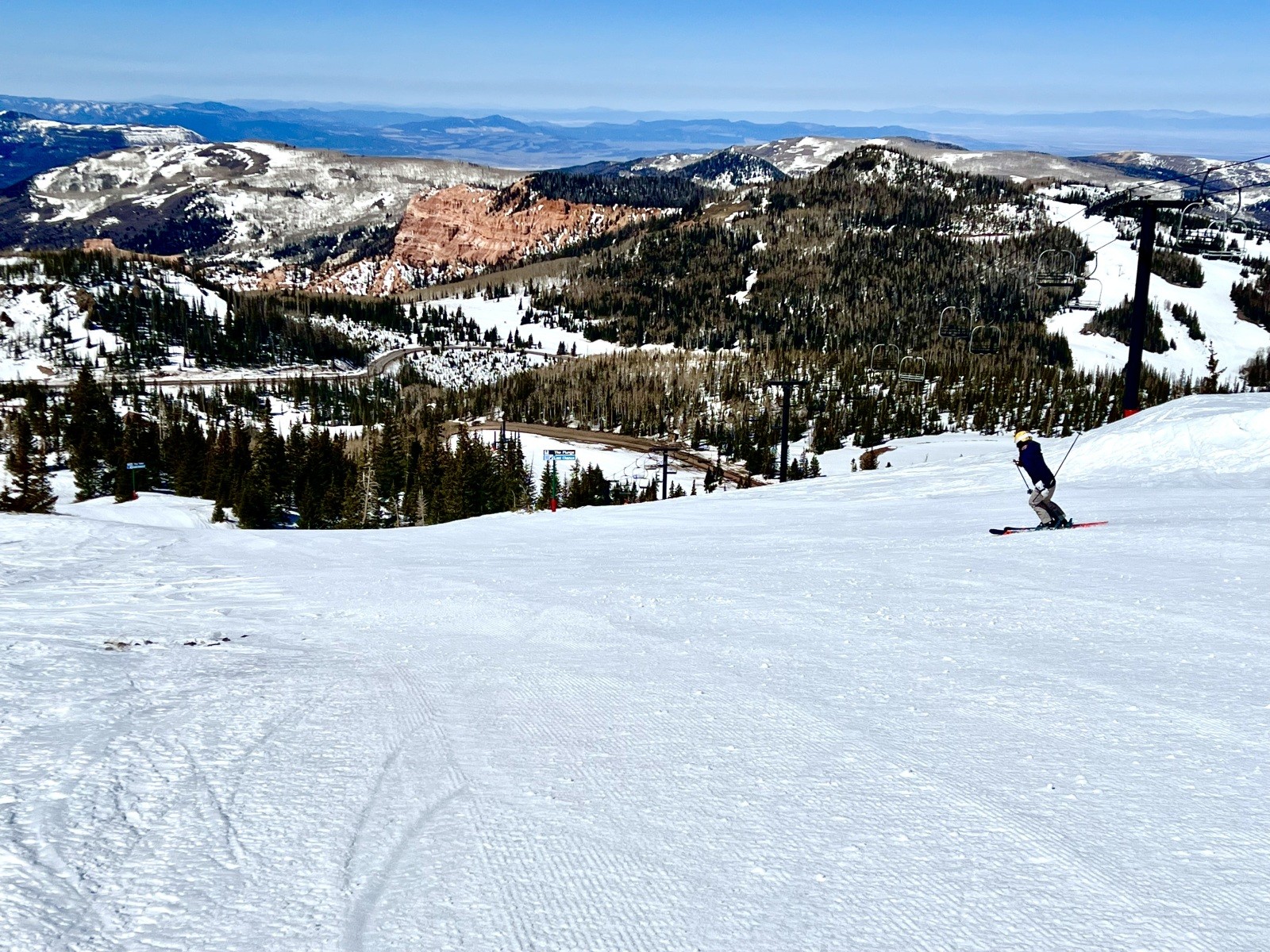 We were still riding an adrenaline high from our blockbuster activities and chose to tackle the more-challenging terrain off Brian Head Peak. At over 11,000 feet, these are some of Utah’s highest elevation runs. They are also some of the most scenic. We did multiple laps off The Dunes Lift aka #7 (Brian Head’s lifts have both names and numbers) on Wild Ride and Hard Times, which were not only empty on a weekday but provided breathtaking views of the Cedar Breaks hoodoos we dined at the night before.