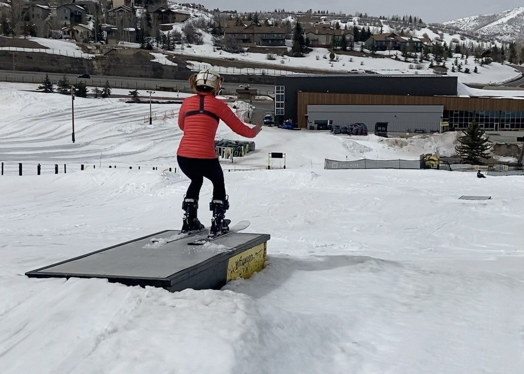 “Can we try some boxes?” I asked. “Sure,” Felix replied. After learning how to approach and land jumps, flat boxes were easy-peasy. Rails? Maybe another lesson, but I’m definitely hitting the terrain park next time to try (show off) my skills.