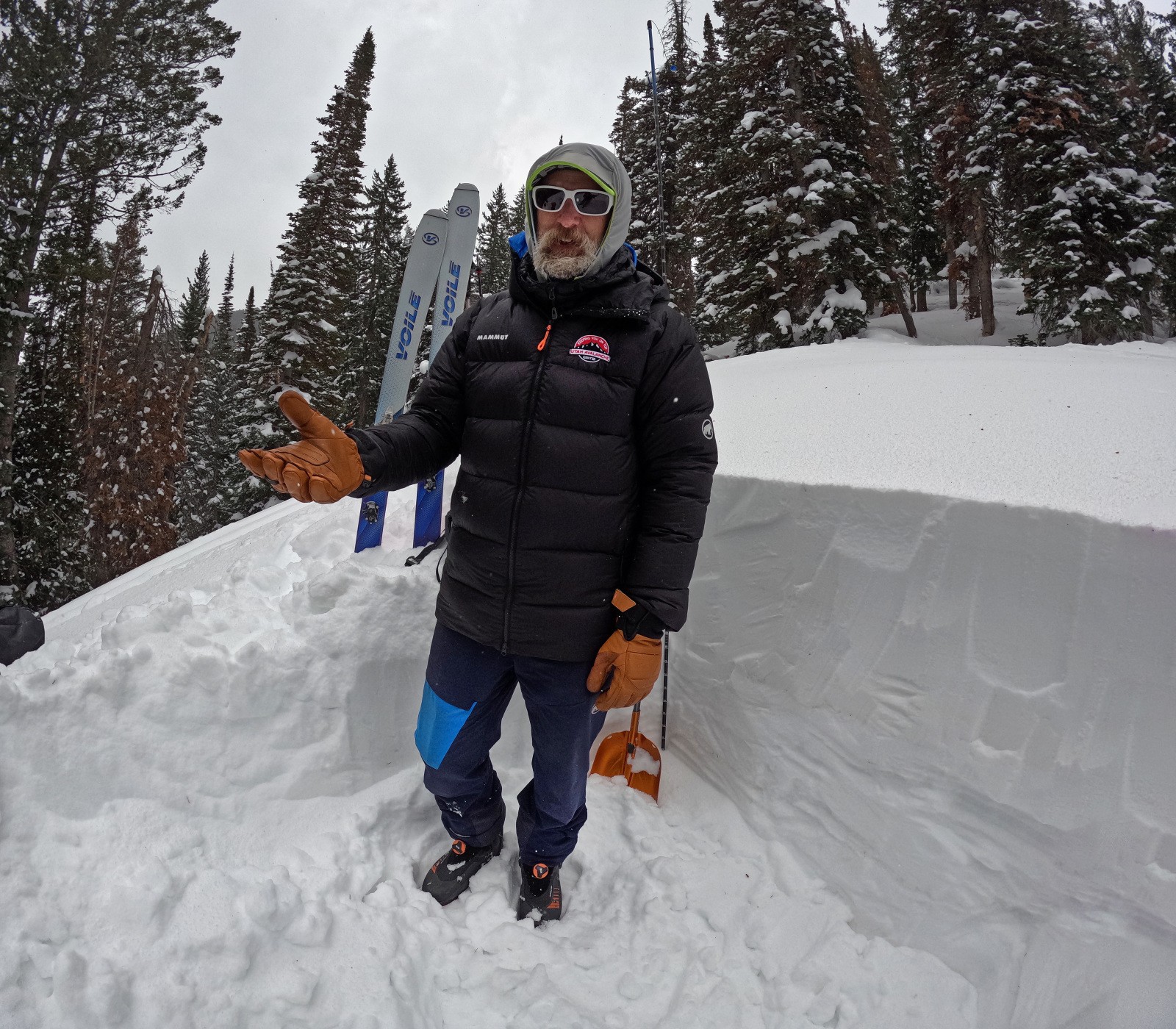 Our outing was a simple one, heading up from the Guardsman Pass Road trailhead at the upper reaches of Big Cottonwood Canyon, climbing through magical aspen trees up a low angle ridgeline on the western flank of 10420. Finding a clearing amidst the snow-laden evergreens, Hardesty skillfully dug a nearly six-foot deep snow pit.