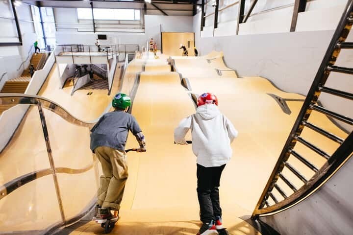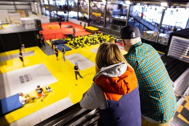 The indoor Action Sports Hub features 66,000 sq. ft. of fun with action sports concrete park, pump track, mini ramps, parkour zone, spring floor, Olympic grade trampolines and foam pits.