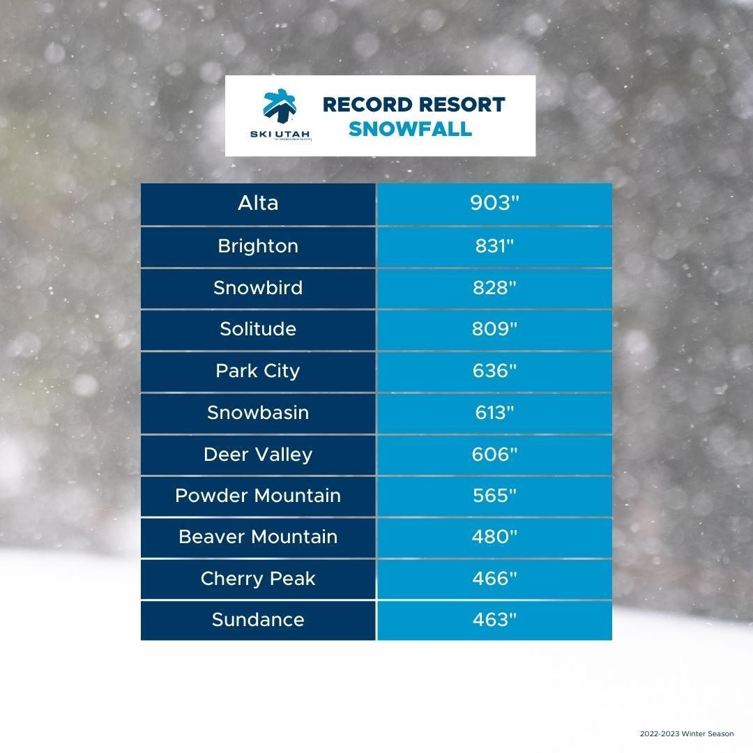 Alta Ski Area is approaching 900 inches (it broke the mark a few days after our recording). That's just kind of a crazy number to say 900 inches at Alta. They're sitting atop the leaderboard and they do a really good job of keeping those snow totals as well, a great database of all the previous years. So hitting 900 inches when they averaged just over 500, you're basically almost seeing, you know, two snow packs in one at some of the resorts. Everyone broke their all time record. Brighton broke their record, you know, just above 850 inches, you have Snowbird above 800 inches breaking their record. You have Solitude Mountain Resort that broke their record. Even Park City Mountain was seeing more Little Cottonwood Canyon type snow this year with five to 600 inches of snow. Snowbasin Resort broke their records. Sundance Mountain Resort approaching 500 inches broke their record. So pretty much every resort in northern Utah saw their all time totals.