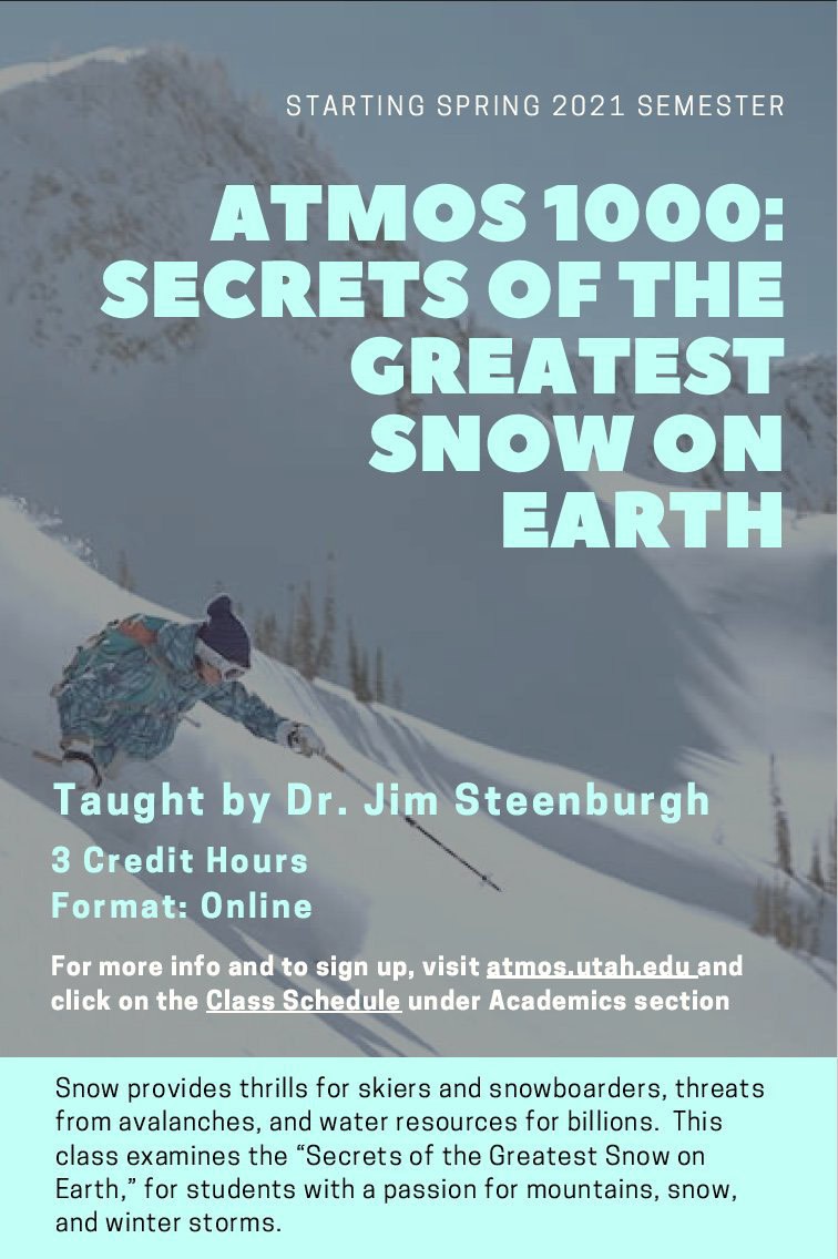 Jim Steenburgh: |00:04:53|That's right. AMOS 1000 at the University of Utah. It's called Secrets of The Greatest Snow on Earth. It's a general education science class can be taken by anybody at the university. And it can also be taken through our continuing education class, our continuing education program if you're not a University of Utah student.