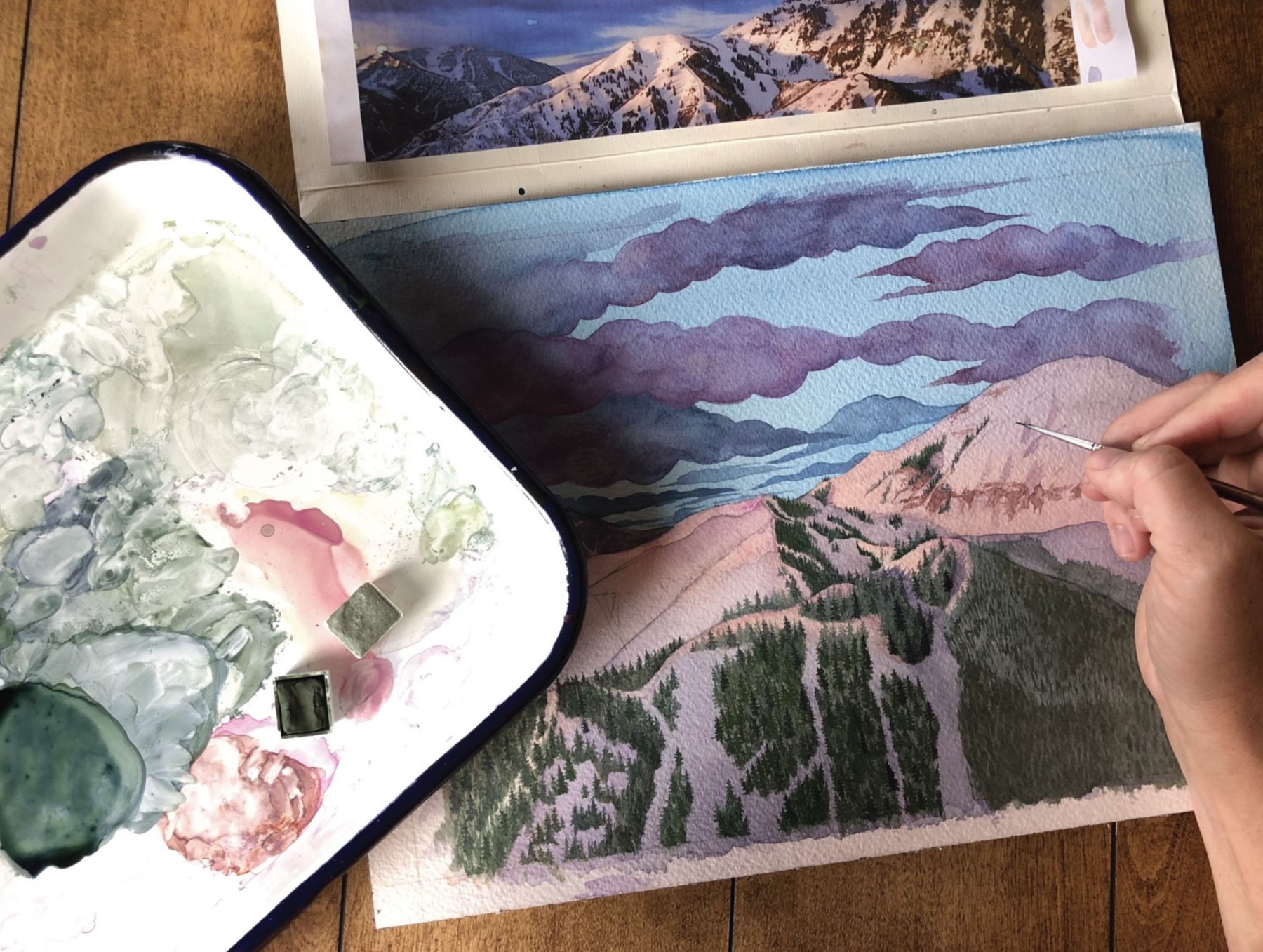Notice the subtle tones of the watercolors as artist Lexi Dowdall paints her impressions of Sundance Mountain Resort.
