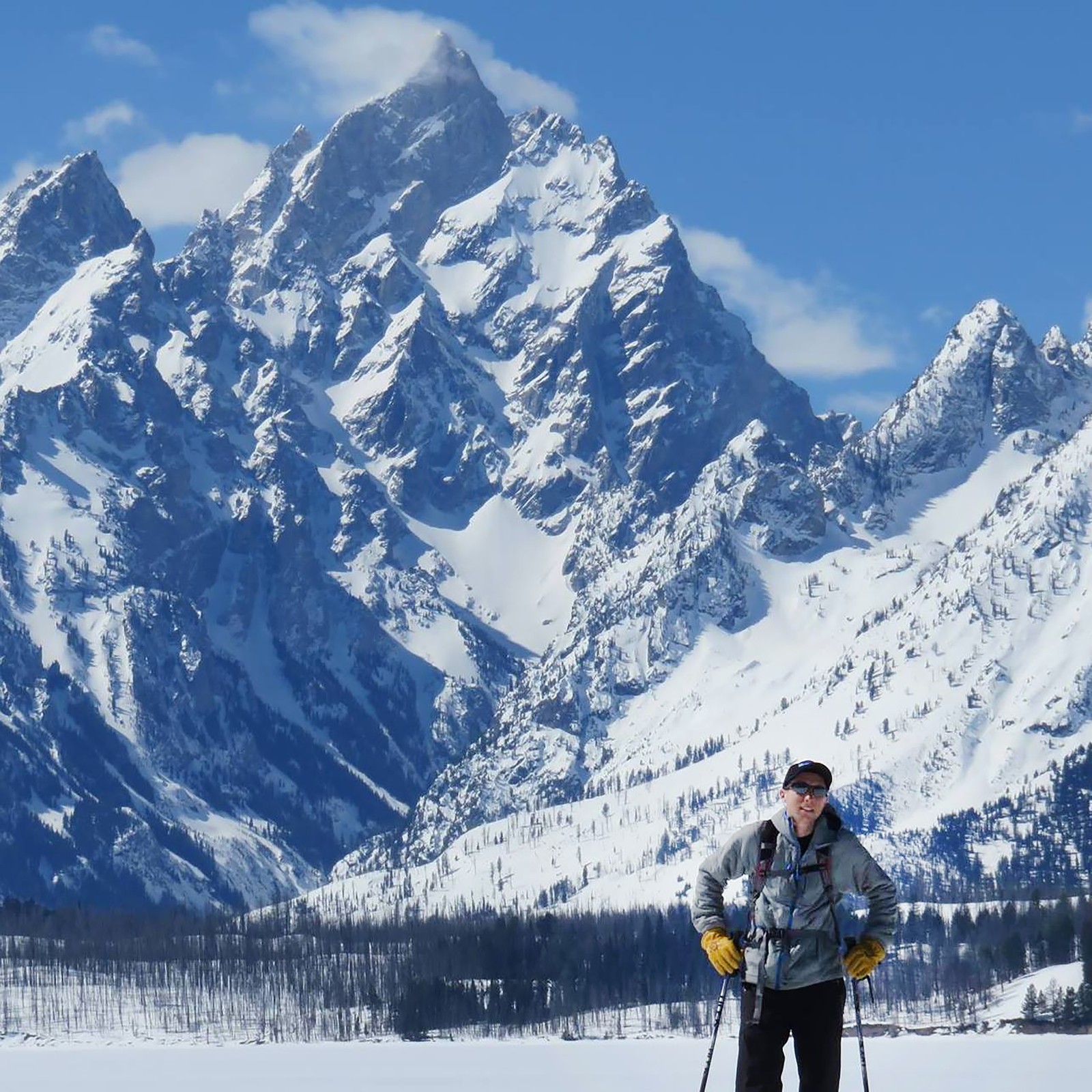 Peter Landsman, skins on and deep in powder with the Grand Teton in the background.