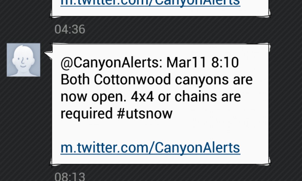 Getting up the 8 miles of Little Cottonwood Canyon to Snowbird on powder days can sometimes can be challenging with avalanche control and four wheel drive and chain restrictions. Signing up at http://updsl.org/services/canyonalerts for texts, tweets, emails or even Facebook updates saves sitting at the mouth waiting. Or getting turned away.