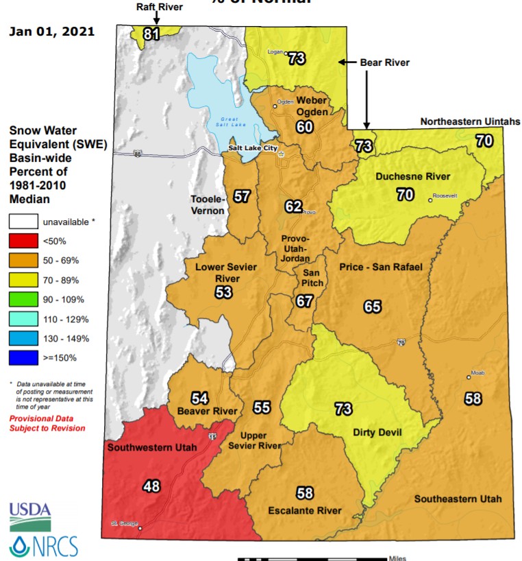 As you can see, I have annotated the snowpack graph to reflect some of the notable periods of dry weather and then some of the more significant storm cycles during the season. We had an auspicious start to the 2020–21 ski season in Utah with a large storm cycle in mid-November that built an adequate base for resorts to open. Unfortunately, we then saw an extended period of dry weather for the second half of November into early December, which caused us to fall below normal snowpack. Luckily, the storms did start returning around the holiday season. However, they were generally smaller systems with only light refreshes of the snowpack. As we flipped the calendar to 2021, our snowpack was running noticeably below normal: