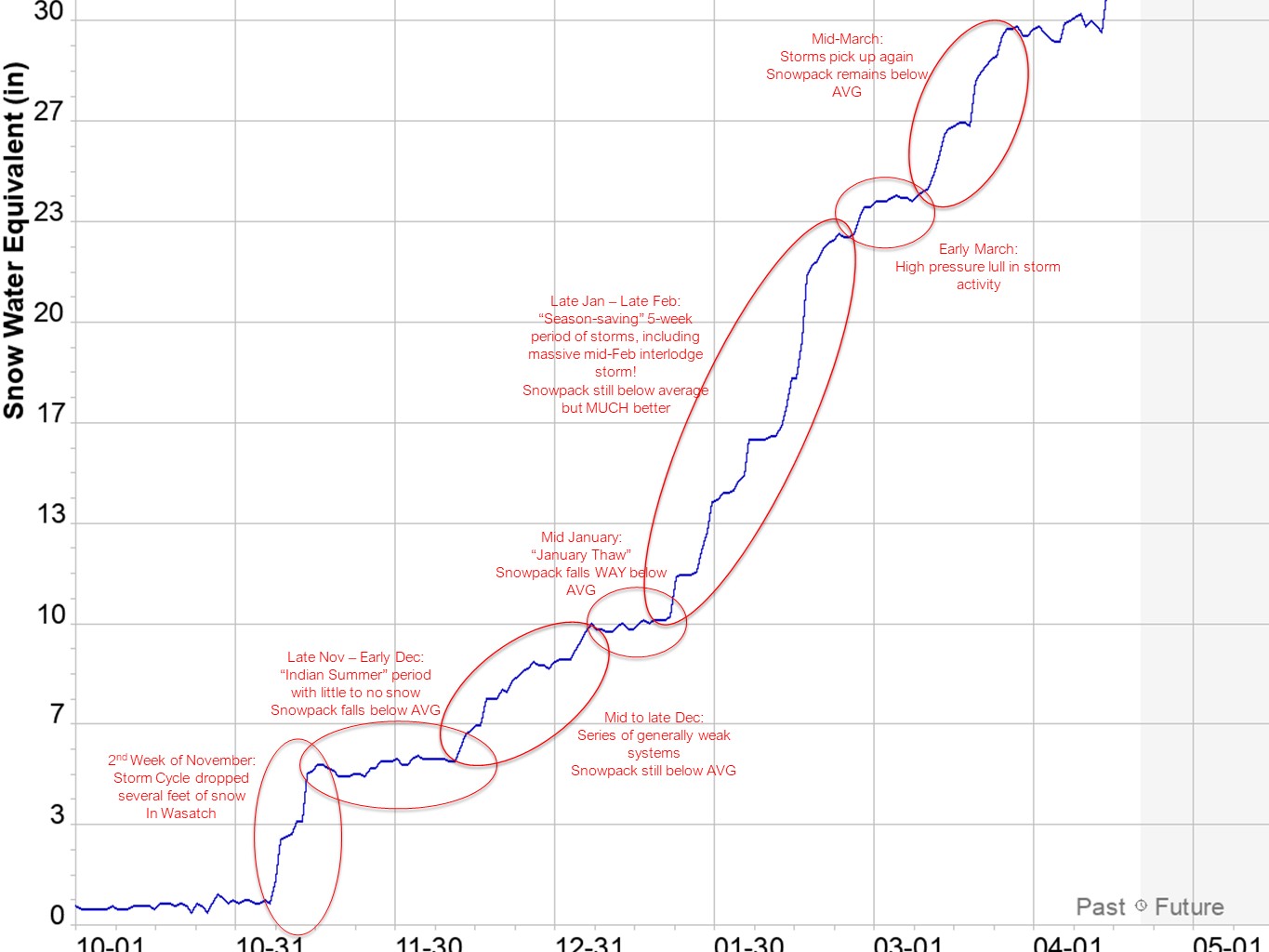 For the purposes of this blog, I am going to use the Snotel site in Little Cottonwood Canyon as a general guide to our season. Why that site? Because it would take me forever to break down every individual location and Little Cottonwood Canyon is one of the snowiest locations in the state. It also has reliable data and is centrally located to eight of the state's 15 resorts. Here is a detailed breakdown of the snowpack at this site this season:
