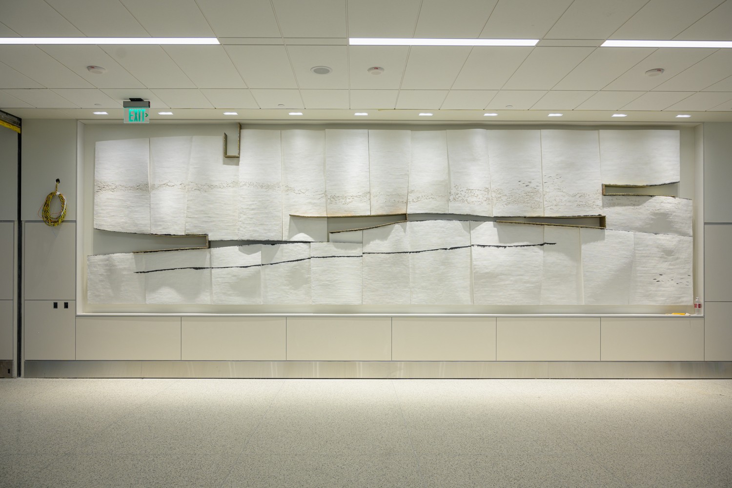 As you make your way out of the terminal and into baggage claim you’ll see the lower portion of yet another grand art installation, The Falls. This dichroic and hand-pulled-glass sculpture, also created by Huether, cascades the length of a three-level escalator well. “Since slot canyons are formed by water, created a prismatic installation inspired by the movement of water just made sense to me,” Huether said.