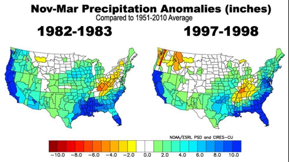 Typically, El Niño years are much better for southern Utah than they are for Northern Utah. The Wasatch has seen our El Niño winters go either way. However, history does suggest that the strongest El Niño events push the heavier precipitation farther north. Here is a map of precipitation anomalies for the two strongest El Niño events on records, 1982-83 and 1997-98: