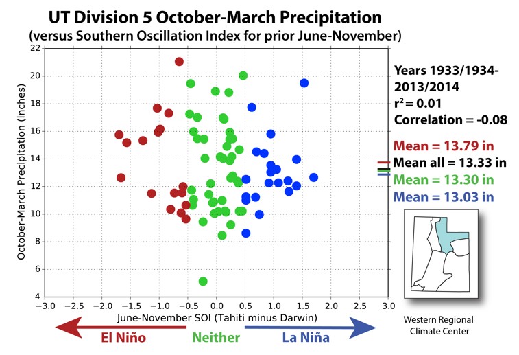 What does seem obvious to me is that the stronger El Niño becomes, the better our chances become of seeing a good winter in Utah. The below scatterplot shows each of our winter seasons in Northern Utah, their total average precipitation, and the corresponding strength of El Niño or its cool counterpart, La Niña: