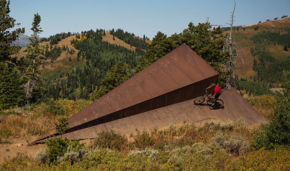 A day biking at Powder Mountain isn't complete until you've ridden on the metal wing that is incorporated into their Paper Airplane trail. This 20x60ft sculpture was originally on display down in the valley before it was relocated into the trail. The trail brings riders up to a very manageable transition, encouraging riders to wall-ride the lower wing. We spent some time lapping the sculpture in both directions and they are both fun.