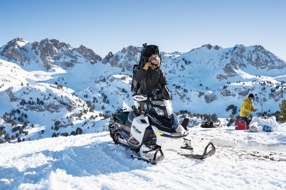 After a night at the Econo Lodge, Girardi got up at 6am, packed his car, gassed up his snowmobile, had breakfast and coffee, drove up to the trailhead, loaded up the snowmobile, and sledded up to the shoot by 7am. First, he shot riders dropping into a couple of steep, freeride lines in the morning sun. Once he finished, the entire crew moved onto the jump they built the day before.
