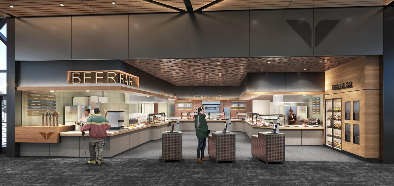 Re-opening in the 2025-26 winter season, this rebuilt mid-mountain restaurant features spectacular views.