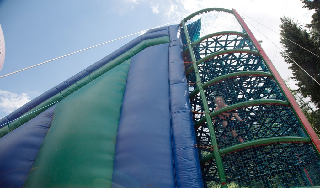 A climbing tower with an inflatable slide exit for children. Made up of multiple layers of flexible webs of flat webbing straps, this kids-only attraction is guaranteed to give your young ones a workout with a quick steep slide down as the reward for making it to the top.