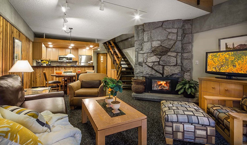 Accommodations vary from hotel bedrooms to one bedroom condominiums with a loft and all rooms feature mountain views with exterior balconies. Fireplaces and kitchens are available in the condominiums