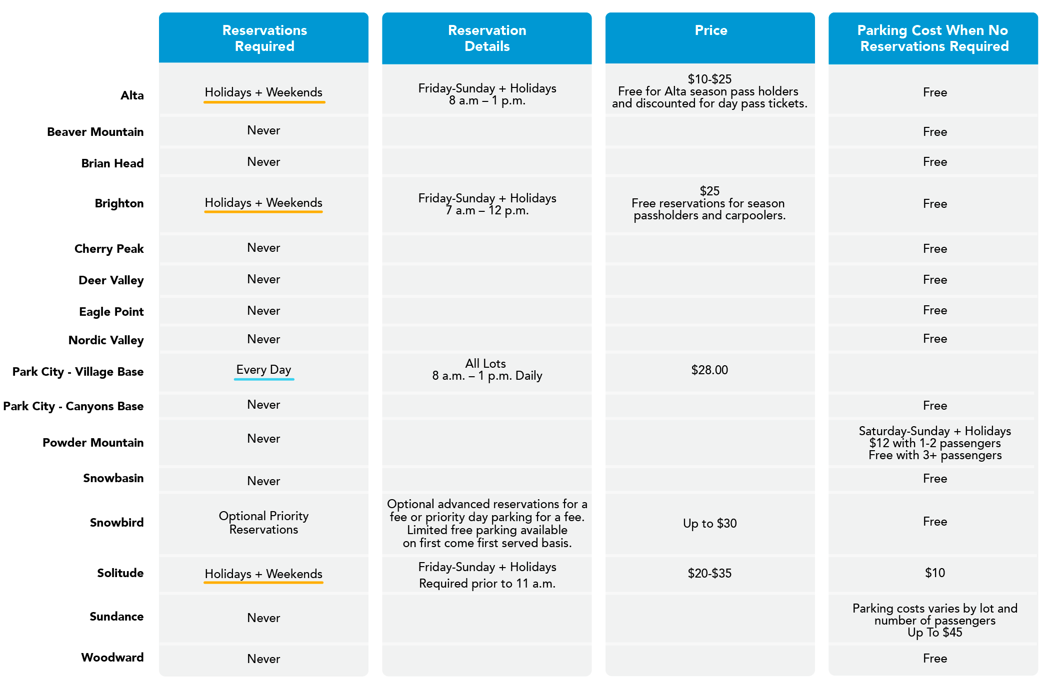 - Alta Ski Area —reservations required Friday-Sunday and holidays, 8 a.m. to 1 p.m., altaparking.com; early morning reservations are required Monday-Thursday, 6 to 8 a.m., Friday-Sunday and holidays, 6 a.m. to 1 p.m., altaearlyparking.com