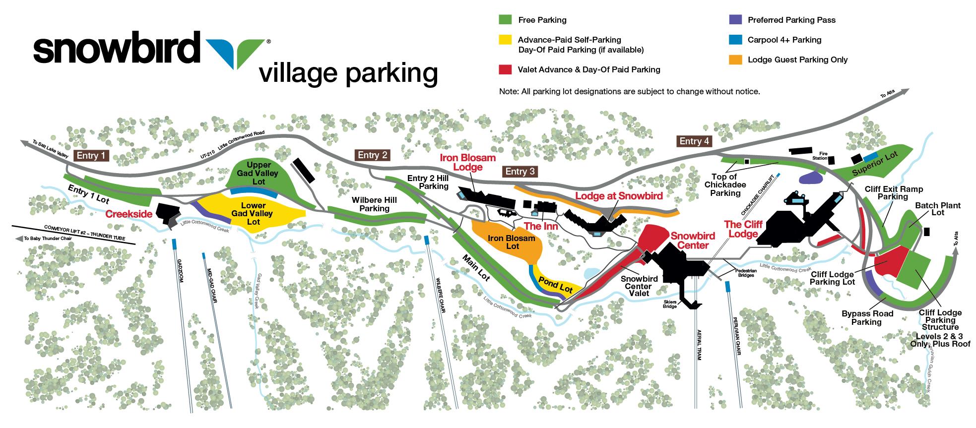 - Snowbird —parking options include free, no reservation required; day-of paid parking (on a space-available basis); pre-reserved paid parking; and valet parking. Snowbird has again expanded its free carpool parking for the 2025-26 winter season, available to vehicles with 3+ passengers, snowbird.com/parking